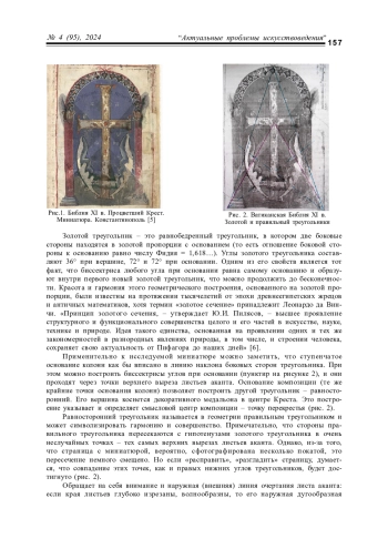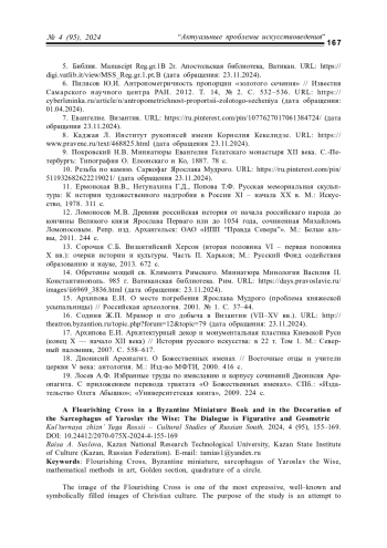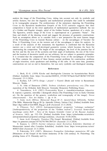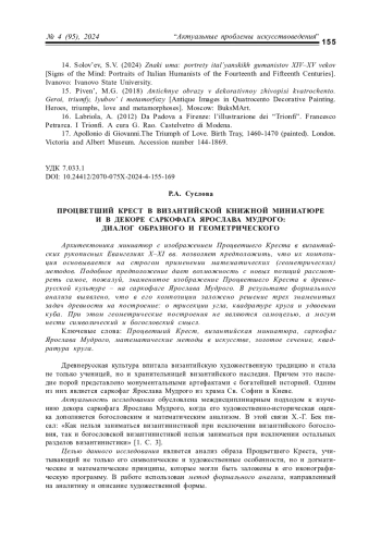 Архитектоника миниатюр с изображением Процветшего Креста в византийских рукописных Евангелиях X–XI вв. позволяет предположить, что их композиция основывается на строгом применении математических (геометрических) методов. Подобное предположение дает возможность с новых позиций рассмотреть самое, пожалуй, знаменитое изображение Процветшего Креста в древнерусской культуре – на саркофаге Ярослава Мудрого. В результате формального анализа выявлено, что в его композиции заложено решение трех знаменитых задач древности на построение: о трисекции угла, квадратуре круга и удвоении куба. При этом геометрические построения не являются самоцелью, а могут нести символический и богословский смысл