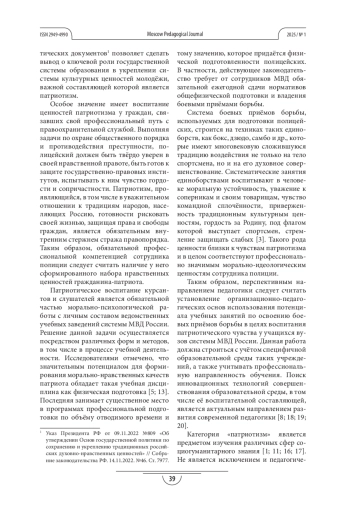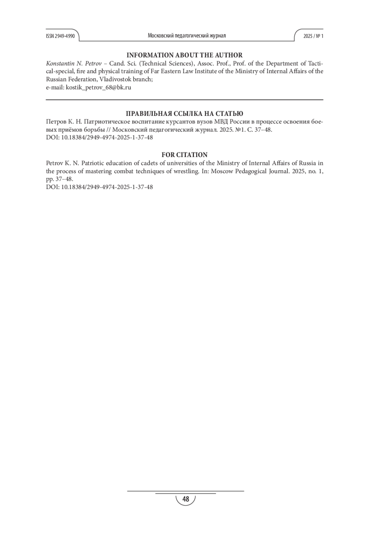 Выводы. Патриотизм является важной составляющей профессионального самосознания сотрудника полиции. Существенным потенциалом для организации воспитательной работы с курсантами вузов МВД в данном направлении обладают занятия по освоению боевых приёмов борьбы. Последние служат не только физическому развитию и укреплению волевых качеств, но и несут позитивное духовно-нравственное наследие традиционных единоборств.