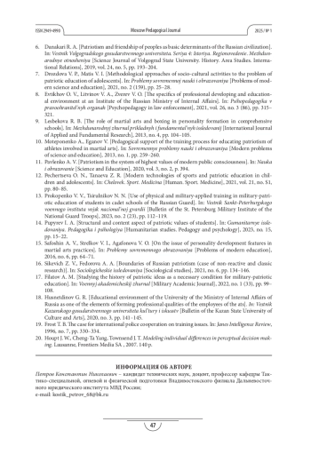 13. Прокопенко В. В., Цирульников Н. Н. Использование средств физической и военно-прикладной подготовки в военно-патриотическом воспитании обучающихся в кадетских училищах Росгвардии // Вестник Санкт-Петербургского военного института войск национальной гвардии. 2023. №2 (23). С. 112-119. EDN: AXSYPG