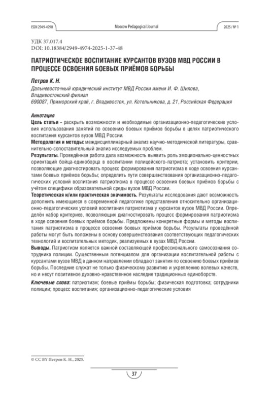 Теоретическая и/или практическая значимость. Результаты исследования дают возможность дополнить имеющиеся в современной педагогике представления относительно организационно-педагогических условий воспитания патриотизма у курсантов вузов МВД России. Определён набор критериев, позволяющих диагностировать процесс формирования патриотизма в ходе освоения боевых приёмов борьбы. Предложены конкретные формы и методы воспитания патриотизма в процессе освоения боевых приёмов борьбы.