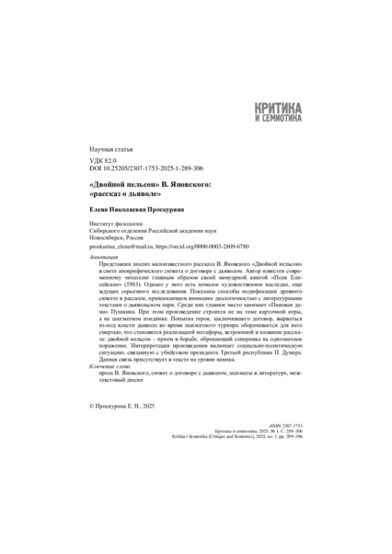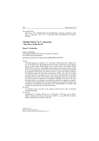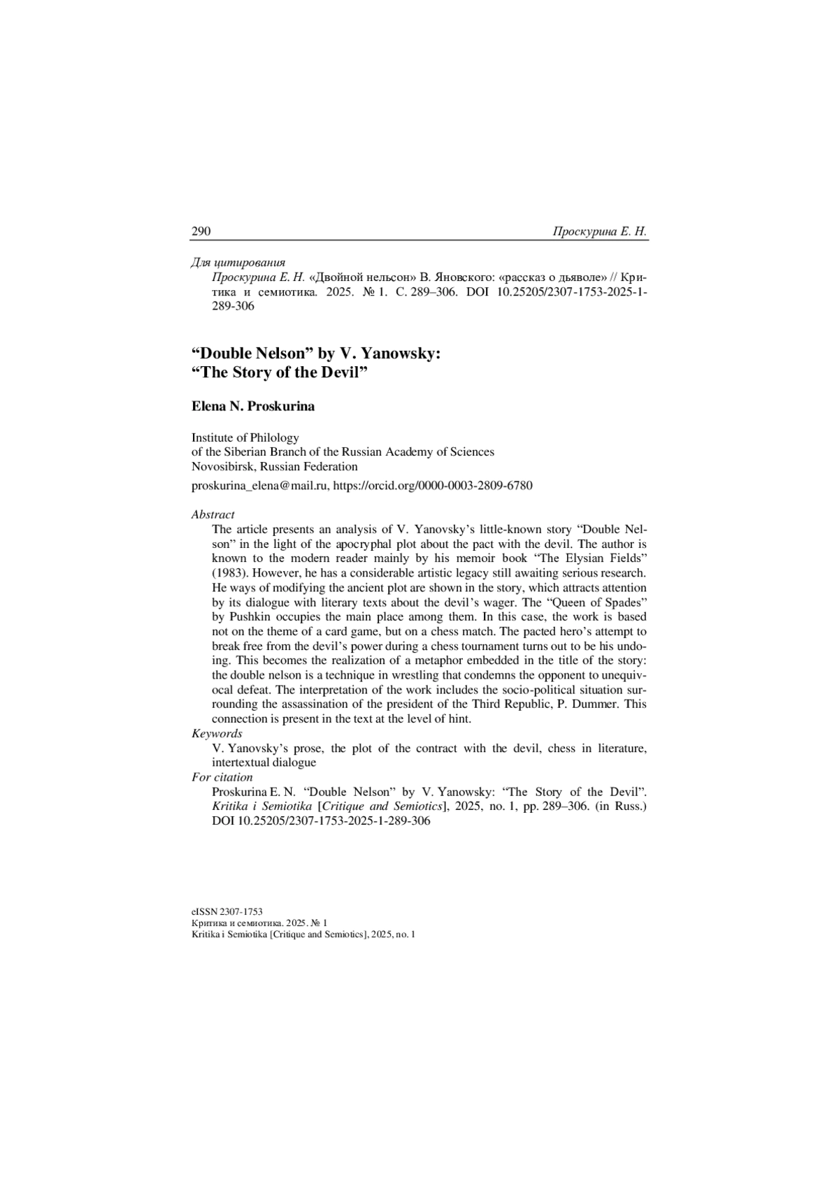Представлен анализ малоизвестного рассказа В. Яновского «Двойной нельсон» в свете апокрифического сюжета о договоре с дьяволом. Автор известен современному читателю главным образом своей мемуарной книгой «Поля Елисейские» (1983). Однако у него есть немалое художественное наследие, еще ждущее серьезного исследования. Показаны способы модификации древнего сюжета в рассказе, привлекающем внимание диалогичностью с литературными текстами о дьявольском пари. Среди них главное место занимает «Пиковая дама» Пушкина. При этом произведение строится не на теме карточной игры, а на шахматном поединке. Попытка героя, заключившего договор, вырваться из-под власти дьявола во время шахматного турнира оборачивается для него смертью, что становится реализацией метафоры, встроенной в название рассказа: двойной нельсон – прием в борьбе, обрекающий соперника на однозначное поражение. Интерпретация произведения включает социально-политическую ситуацию, связанную с убийством президента Третьей республики П. Думера. Данная связь присутствует в тексте на уровне намека.