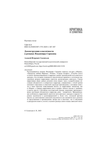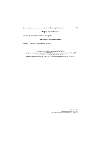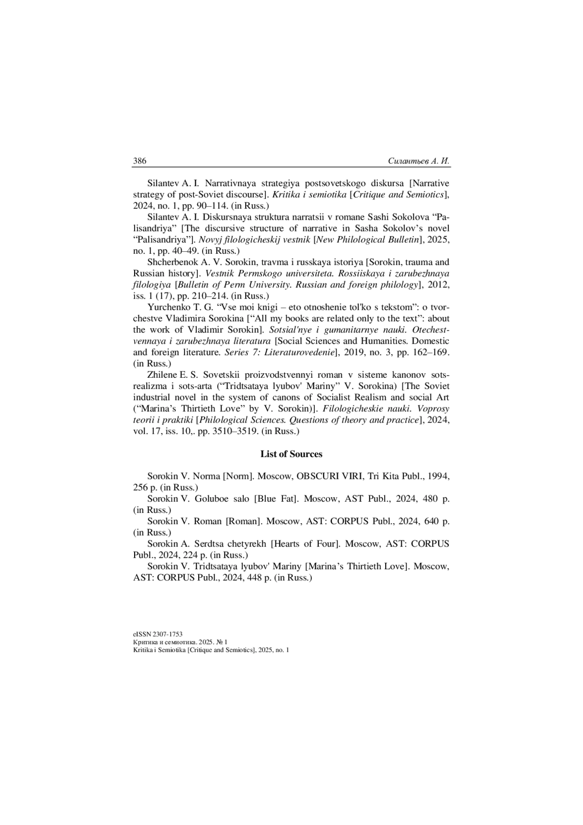 13. Силантьев А. И. Нарративная стратегия постсоветского дискурса // Критика и семиотика. 2024. № 1. С. 90-114.
