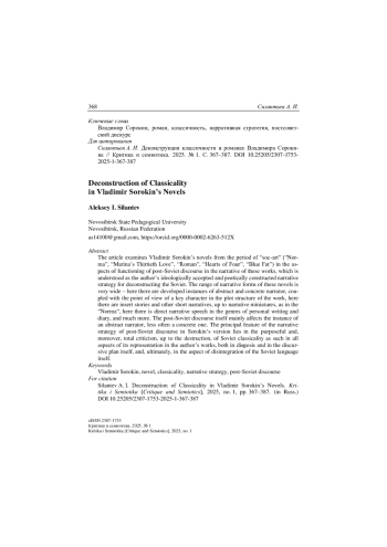 Рассматриваются романы Владимира Сорокина периода соц-арта («Норма», «Тридцатая любовь Марины», «Роман», «Сердца четырех», «Голубое сало») в аспекте функционирования в наррации данных произведений постсоветского дискурса, под которым понимается идеологически принятая и поэтически выстроенная автором нарративная стратегия деконструкции советского. Спектр нарративных форм данных романов очень широк: здесь и разработанные инстанции абстрактного и конкретного нарратора, сопряженные с точкой зрения ключевого персонажа в сюжетной структуре произведения, и вставные новеллы и иные короткие повествования вплоть до нарративных миниатюр, как в «Норме», и прямая нарративная речь в жанрах личного письма и дневника, и многое другое. Собственно постсоветский дискурс затрагивает преимущественно инстанцию абстрактного нарратора, реже – конкретного. Принципиальная особенность нарративной стратегии постсоветского дискурса в версии Сорокина заключается в целенаправленной и, более того, тотальной критике (вплоть до уничтожения) советской классичности как таковой во всех аспектах ее представления в произведениях автора как в диегезисе, так и собственно в дискурсном плане и, в итоге, в аспекте распада самого языка советской эпохи.