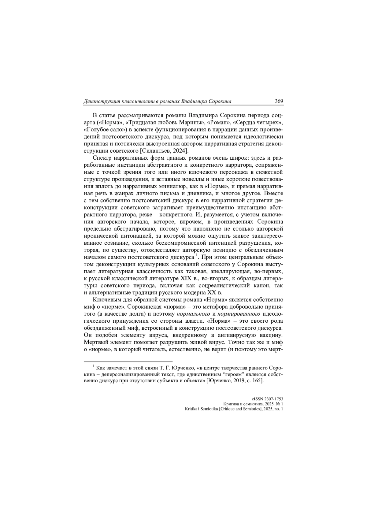 16. Юрченко Т. Г. “Все мои книги - это отношение только с текстом”: о творчестве Владимира Сорокина // Социальные и гуманитарные науки. Отечественная и зарубежная литература. Сер. 7: Литературоведение. 2019. № 3. С. 162-169.