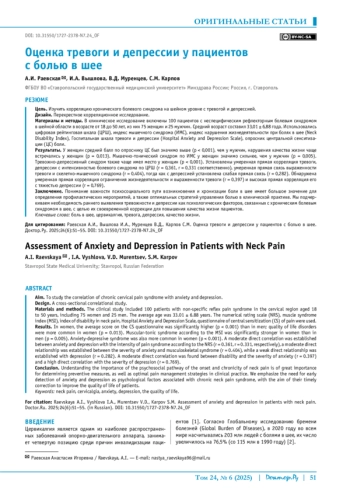 Цель. Изучить корреляцию хронического болевого синдрома на шейном уровне с тревогой и депрессией.