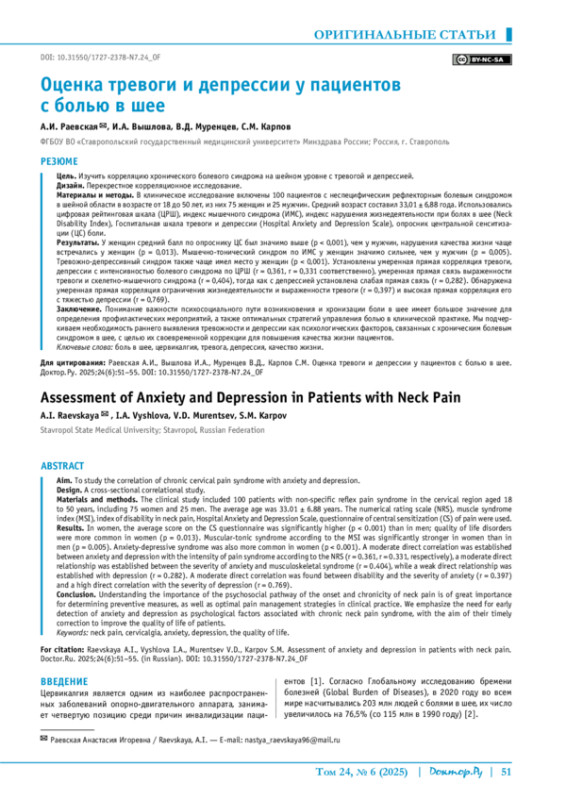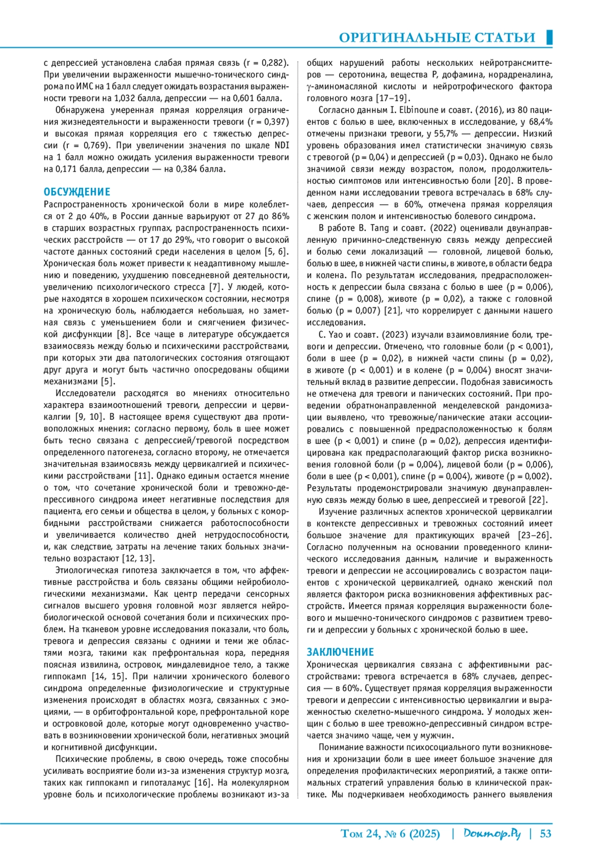 Заключение. Понимание важности психосоциального пути возникновения и хронизации боли в шее имеет большое значение для определения профилактических мероприятий, а также оптимальных стратегий управления болью в клинической практике. Мы подчеркиваем необходимость раннего выявления тревожности и депрессии как психологических факторов, связанных с хроническим болевым синдромом в шее, с целью их своевременной коррекции для повышения качества жизни пациентов.