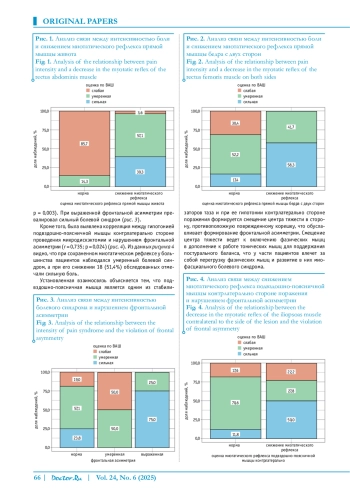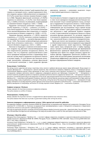 Результаты. После проведения курса кинезиотейпирования у 25 (71,4%) пациентов отмечалось снижение интенсивности болевого синдрома по ВАШ. Согласно данным стабилометрического исследования, у 8 (22,9%) человек улучшилась функция равновесия, в 9 (25,7%) случаях выявлено снижение фронтальной и сагиттальной асимметрии. Однако у 10 (28,6%) пациентов наблюдалось усиление фронтальной и сагиттальной асимметрии, что, вероятно, связано с изменением мышечного тонуса и перестройкой двигательного стереотипа под действием тейпа.
