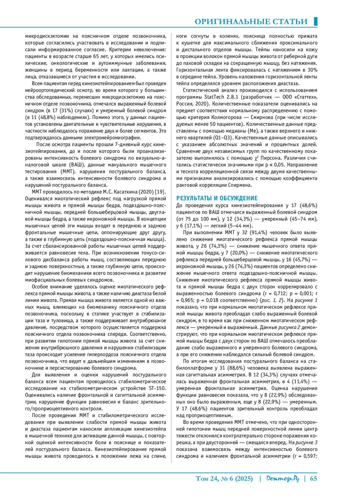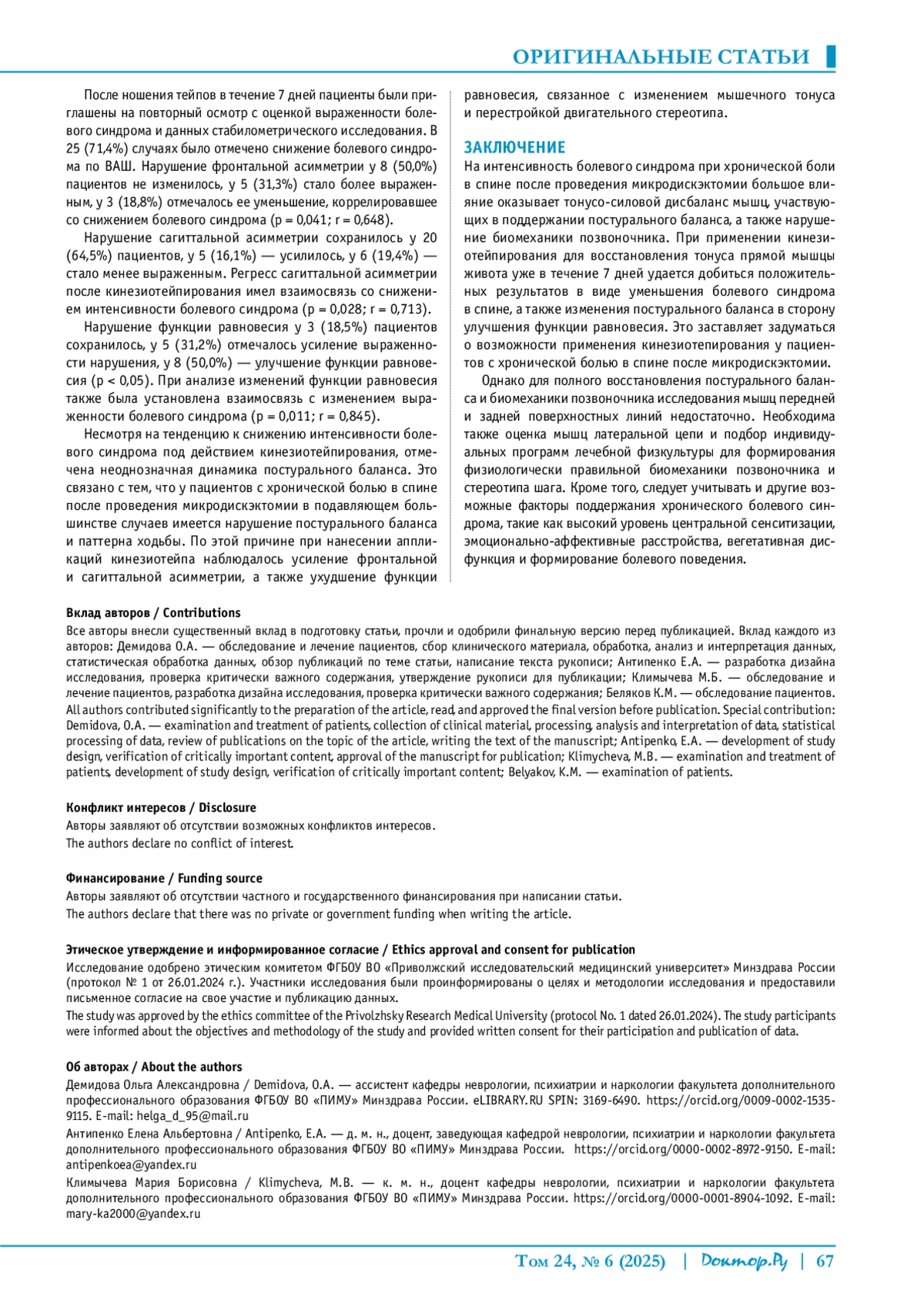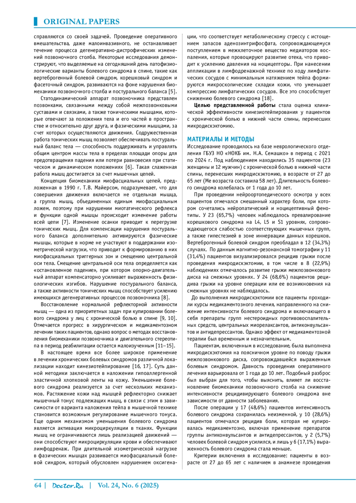 ДЕМИДОВА О. А., АНТИПЕНКО Е. А., КЛИМЫЧЕВА М. Б., БЕЛЯКОВ К. М. ОПЫТ ПРИМЕНЕНИЯ КИНЕЗИОТЕЙПИРОВАНИЯ У ПАЦИЕНТОВ С ХРОНИЧЕСКОЙ БОЛЬЮ В СПИНЕ ПОСЛЕ МИКРОДИСКЭКТОМИИ // ДОКТОР. РУ. 2025. № 6, ТОМ 24