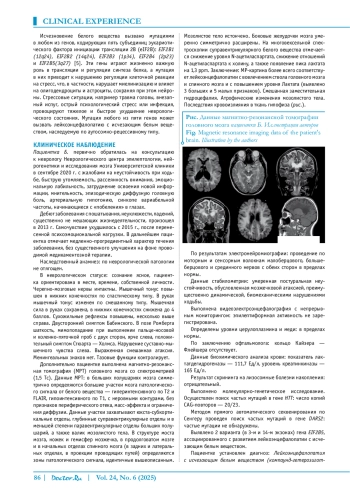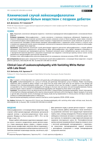 Заключение. Представленный клинический случай демонстрирует трудности диагностики лейкоэнцефолопатии с поздним дебютом заболевания. Генетическая гетерогенность наследственных форм лейкоэнцефалопатии часто требует проведения молекулярно-генетического тестирования для подтверждения диагноза. Регулярный повторный анализ необработанных данных экзома или генома и периодический пересмотр фенотипа и результатов визуализации при внедрении в клиническую практику помогут снизить частоту невыявленных лейкодистрофий в долгосрочной перспективе.