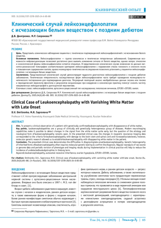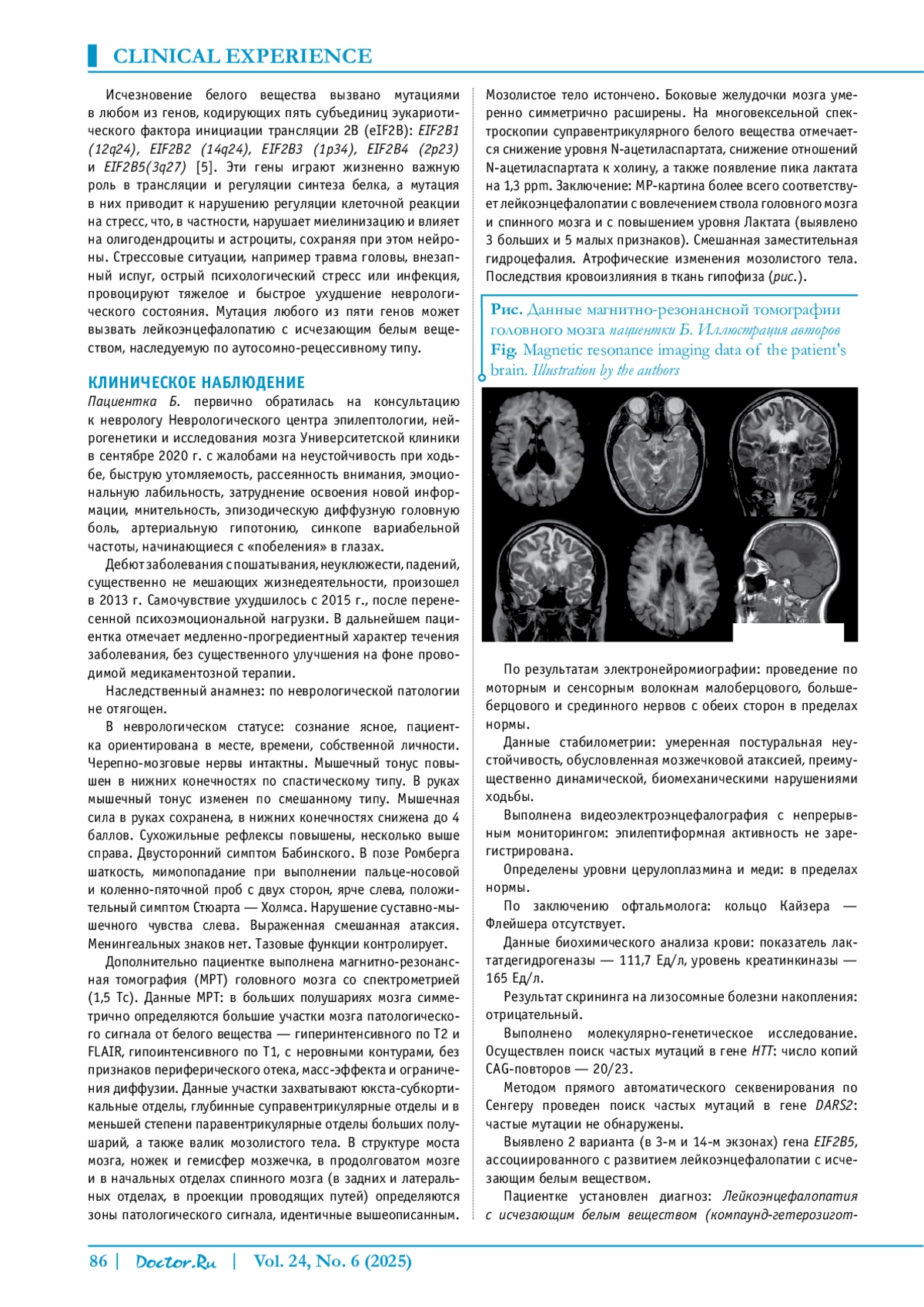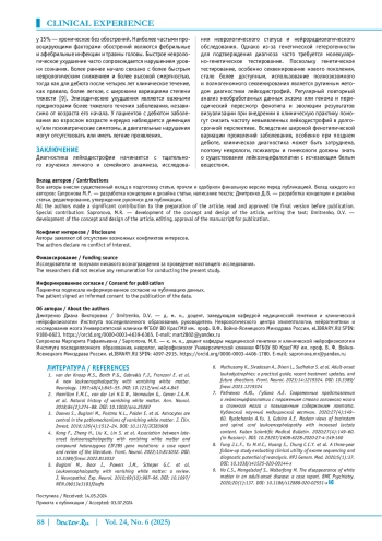 5. Bugiani A.L, Boor I., Powers J.M., Scheper G.C. et al. Leukoencephalopathy with vanishing white matter: a review. 3. Neuropathol. Exp. Neurol. 2010;69(10):987-96. 10.1097/ NEN. ObOl 3e3181f2eafa Поступила / Received: 14.05.2024 Принята к публикации / Accepted: 03.07.2024. DOI: 10.1097/NEN.ObOl3e3181f2eafa