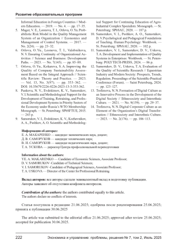 2. Евдокимов К. В., Саморуков В. И., Люлин А. Б. Развитие системы дополнительного образования в условиях цифровой экономики России // Научное обеспечение развития АПК в условиях импортозамещения: сборник научных трудов. - Санкт- Петербург, 2018. - С. 310-313. EDN: YWJTUU