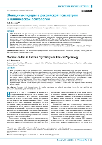 Цель. Рассмотреть роль трех женщин-ученых в становлении и развитии отечественной психиатрии и клинической психологии.