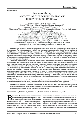 Рассмотрена проблема оценки человеческого капитала с позиции ее методологической формализации. Проведен обзор методов и подходов к оценке состояния человеческого капитала и выделены их основные абсолютные и относительные индикаторы. Обобщена методология расчета индекса и интегрального показателя развития человеческого капитала. Определены компоненты алгоритма формализации оценки «человеческий капитал»: уровни рассмотрения, методы оценивания, формы выражения оценки, типы перемещения капитала и способы инвестирования, принципы развития и современные стратегии управления. Идентифицирован формально-логический метод, систематизированы результаты исследований в деле формирования человеческого капитала. Описаны ключевые подходы к измерению человеческого капитала на различных уровнях с акцентом на их достоинства и недостатки. Определены актуальные параметры методологии формирования интегрального индекса оценки человеческого капитала, включая компетентностный, когнитивно- ценностный и другие подходы. Сформирована интеллектуальная карта, визуализирующая структуру методологии ОЭСР оценки человеческого капитала. Предложено расширить методику оценки человеческого капитала через включение в расчет показателей институциональной системы. Выводы акцентируют внимание на значимости применения достоверной и всесторонней информации, а также на важности ее своевременного обновления, чтобы результаты анализа и оценки отражали истинную стоимость человеческого капитала. Авторами отмечено, что необходимо обеспечение оптимизации процедур сбора и обработки информации для повышения точности оценки человеческого капитала.
