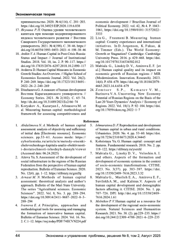 21. Koryakov A., Kazaryan I., Afonasova M. et al. Measuring human capital: methodological framework for assessing competitiveness and economic development // Brazilian Journal of Political Economy. 2022. vol. 42, № 4. P. 1043- 1061,. DOI: 10.1590/0101-31572022-3333 EDN: MJFWDJ