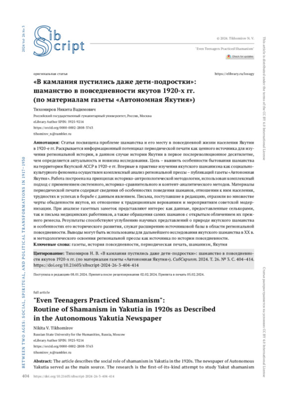 Статья посвящена проблеме шаманства и его месту в повседневной жизни населения Якутии в 1920-е гг. Раскрывается информационный потенциал периодической печати как ценного источника для изучения региональной истории, в данном случае истории Якутии в первое послереволюционное десятилетие, чем определяется актуальность и новизна исследования. Цель – выявить особенности бытования шаманства на территории Якутской АССР в 1920-е гг. Впервые в практике изучения якутского шаманизма как социально-культурного феномена осуществлен комплексный анализ региональной прессы – публикаций газеты «Автономная Якутия». Работа построена на принципах историко-антропологической методологии, использован комплексный подход с применением системного, историко-сравнительного и контент-аналитического методов. Материалы периодической печати содержат сведения об особенностях поведения шаманов, отношении к ним населения, трудностях и успехах в борьбе с данным явлением. Письма, поступавшие в редакцию, отразили во множестве черты обыденности якутов, их отношение к традиционным верованиям и мероприятиям советской модернизации. При анализе газетных заметок представляют интерес как данные, предоставленные селькорами, так и письма медицинских работников, а также обращения самих шаманов с открытым обличением их прежнего ремесла. Результаты способствуют углублению научных представлений о природе якутского шаманства и особенностях его исторического развития, служат расширению источниковой базы в области региональной повседневности. Выводы могут быть использованы для дальнейшего исследования якутского шаманства в ХХ в. и методологического освоения региональной прессы как источника по истории повседневности.