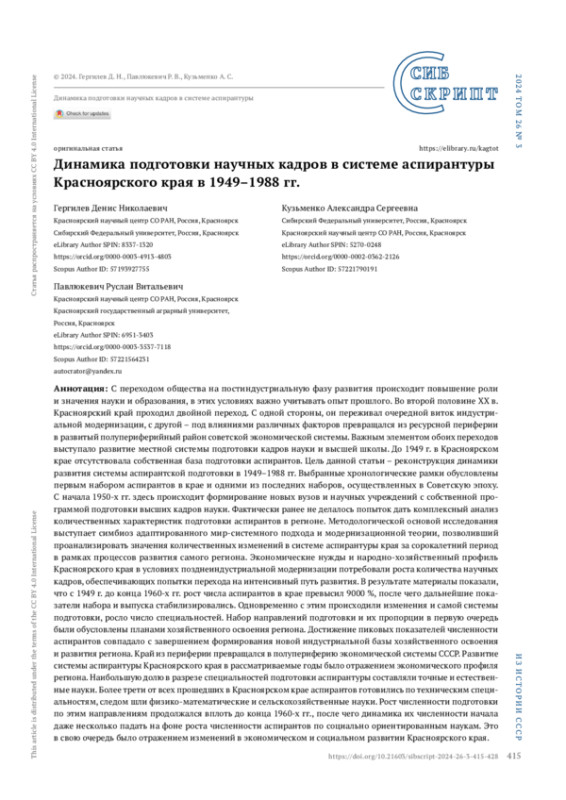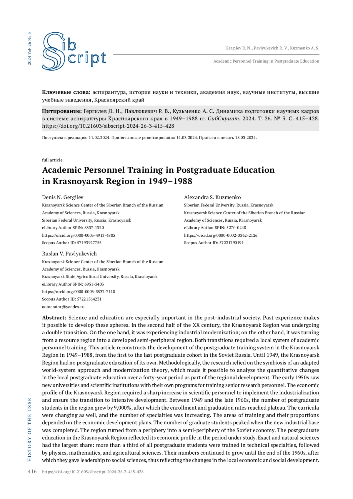 С переходом общества на постиндустриальную фазу развития происходит повышение роли и значения науки и образования, в этих условиях важно учитывать опыт прошлого. Во второй половине ХХ в. Красноярский край проходил двойной переход. С одной стороны, он переживал очередной виток индустриальной модернизации, с другой – под влияниями различных факторов превращался из ресурсной периферии в развитый полупериферийный район советской экономической системы. Важным элементом обоих переходов выступало развитие местной системы подготовки кадров науки и высшей школы. До 1949 г. в Красноярском крае отсутствовала собственная база подготовки аспирантов. Цель данной статьи – реконструкция динамики развития системы аспирантской подготовки в 1949–1988 гг. Выбранные хронологические рамки обусловлены первым набором аспирантов в крае и одними из последних наборов, осуществленных в Советскую эпоху. С начала 1950-х гг. здесь происходит формирование новых вузов и научных учреждений с собственной программой подготовки высших кадров науки. Фактически ранее не делалось попыток дать комплексный анализ количественных характеристик подготовки аспирантов в регионе. Методологической основой исследования выступает симбиоз адаптированного мир-системного подхода и модернизационной теории, позволивший проанализировать значения количественных изменений в системе аспирантуры края за сорокалетний период в рамках процессов развития самого региона. Экономические нужды и народно-хозяйственный профиль Красноярского края в условиях позднеиндустриальной модернизации потребовали роста количества научных кадров, обеспечивающих попытки перехода на интенсивный путь развития. В результате материалы показали, что с 1949 г. до конца 1960-х гг. рост числа аспирантов в крае превысил 9000 %, после чего дальнейшие показатели набора и выпуска стабилизировались. Одновременно с этим происходили изменения и самой системы подготовки, росло число специальностей. Набор направлений подготовки и их пропорции в первую очередь были обусловлены планами хозяйственного освоения региона. Достижение пиковых показателей численности аспирантов совпадало с завершением формирования новой индустриальной базы хозяйственного освоения и развития региона. Край из периферии превращался в полупериферию экономической системы СССР. Развитие системы аспирантуры Красноярского края в рассматриваемые годы было отражением экономического профиля региона. Наибольшую долю в разрезе специальностей подготовки аспирантуры составляли точные и естественные науки. Более трети от всех прошедших в Красноярском крае аспирантов готовились по техническим специальностям, следом шли физико-математические и сельскохозяйственные науки. Рост численности подготовки по этим направлениям продолжался вплоть до конца 1960-х гг., после чего динамика их численности начала даже несколько падать на фоне роста численности аспирантов по социально ориентированным наукам. Это в свою очередь было отражением изменений в экономическом и социальном развитии Красноярского края.