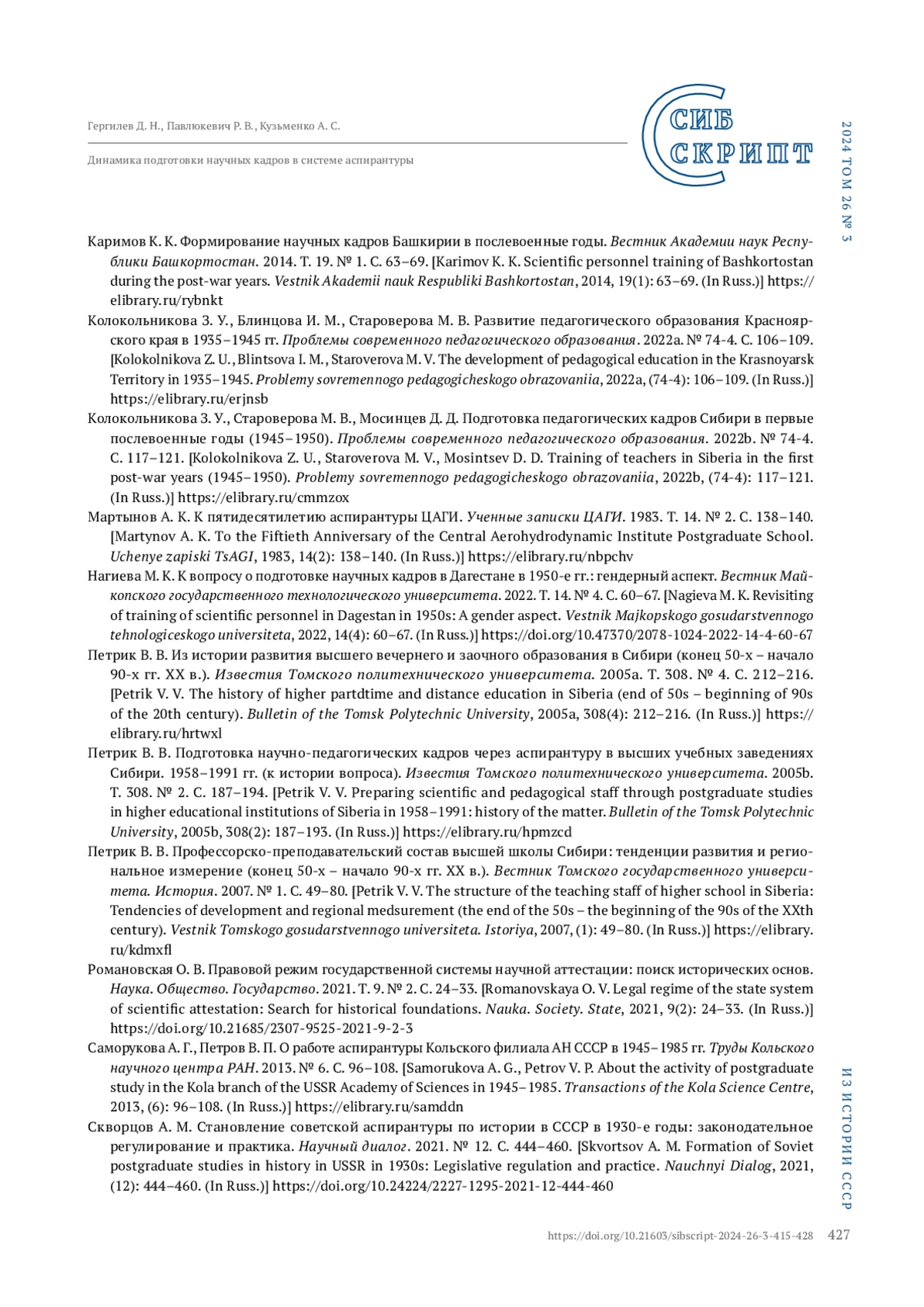 11. Петрик В. В. Подготовка научно-педагогических кадров через аспирантуру в высших учебных заведениях Сибири. 1958-1991 гг. (к истории вопроса). Известия Томского политехнического университета. 2005b. Т. 308. № 2. С. 187-194. https://elibrary.ru/hpmzcd