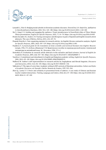 14. Hyland K., Zou H. “I believe the findings are fascinating”: Stance in three-minute theses. Journal of English for Academic Purposes, 2021, 50. https://doi.org/10.1016/j.jeap.2021.100973