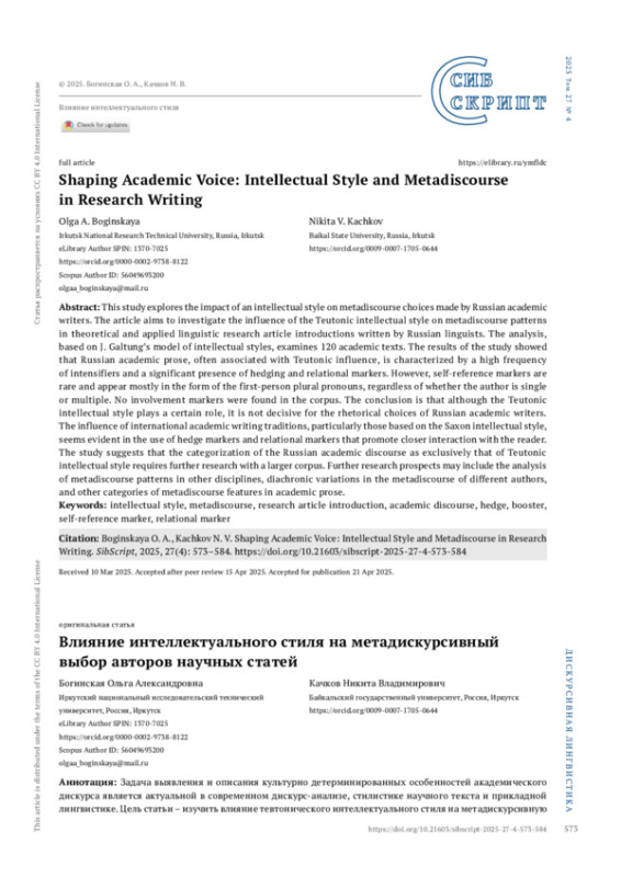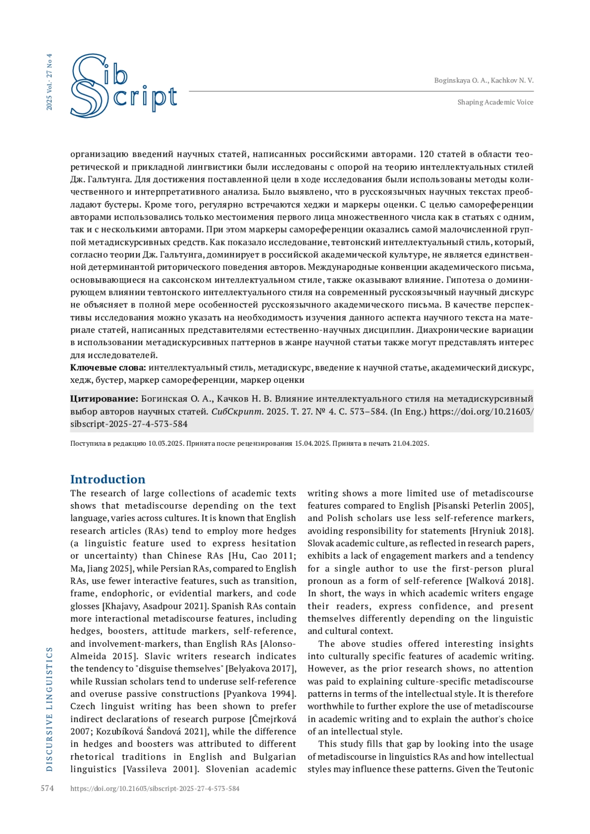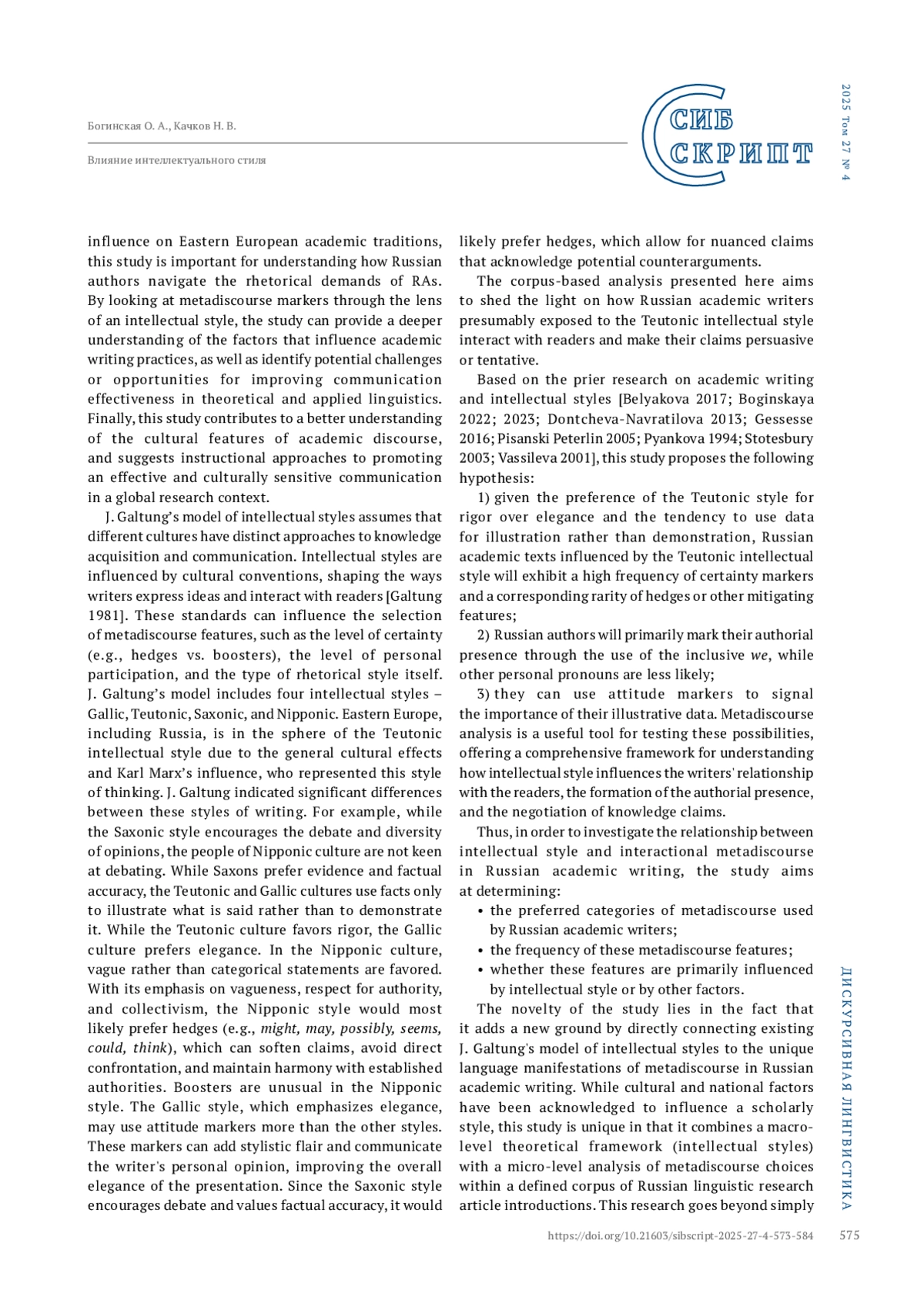 Задача выявления и описания культурно детерминированных особенностей академического дискурса является актуальной в современном дискурс-анализе, стилистике научного текста и прикладной лингвистике. Цель статьи – изучить влияние тевтонического интеллектуального стиля на метадискурсивную организацию введений научных статей, написанных российскими авторами. 120 статей в области теоретической и прикладной лингвистики были исследованы с опорой на теорию интеллектуальных стилей Дж. Гальтунга. Для достижения поставленной цели в ходе исследования были использованы методы количественного и интерпретативного анализа. Было выявлено, что в русскоязычных научных текстах преобладают бустеры. Кроме того, регулярно встречаются хеджи и маркеры оценки. С целью самореференции авторами использовались только местоимения первого лица множественного числа как в статьях с одним, так и с несколькими авторами. При этом маркеры самореференции оказались самой малочисленной группой метадискурсивных средств. Как показало исследование, тевтонский интеллектуальный стиль, который, согласно теории Дж. Гальтунга, доминирует в российской академической культуре, не является единственной детерминантой риторического поведения авторов. Международные конвенции академического письма, основывающиеся на саксонском интеллектуальном стиле, также оказывают влияние. Гипотеза о доминирующем влиянии тевтонского интеллектуального стиля на современный русскоязычный научный дискурс не объясняет в полной мере особенностей русскоязычного академического письма. В качестве перспективы исследования можно указать на необходимость изучения данного аспекта научного текста на материале статей, написанных представителями естественно-научных дисциплин. Диахронические вариации в использовании метадискурсивных паттернов в жанре научной статьи также могут представлять интерес для исследователей.