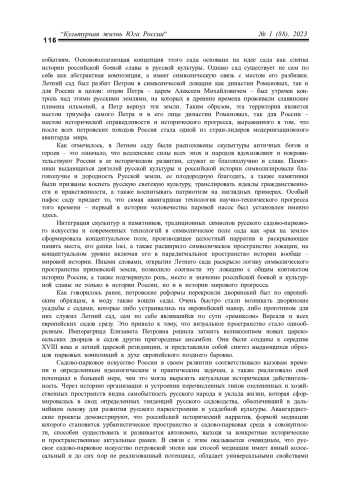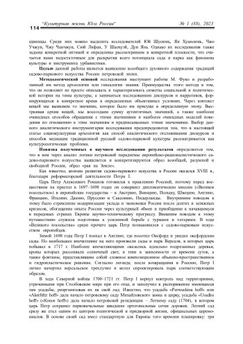 ХУАН К. ОСОБЕННОСТИ САДОВО-ПАРКОВОГО ИСКУССТВА РОССИИ В ПЕТРОВСКУЮ ЭПОХУ // КУЛЬТУРНАЯ ЖИЗНЬ ЮГА РОССИИ. 2023. № 1 (88)