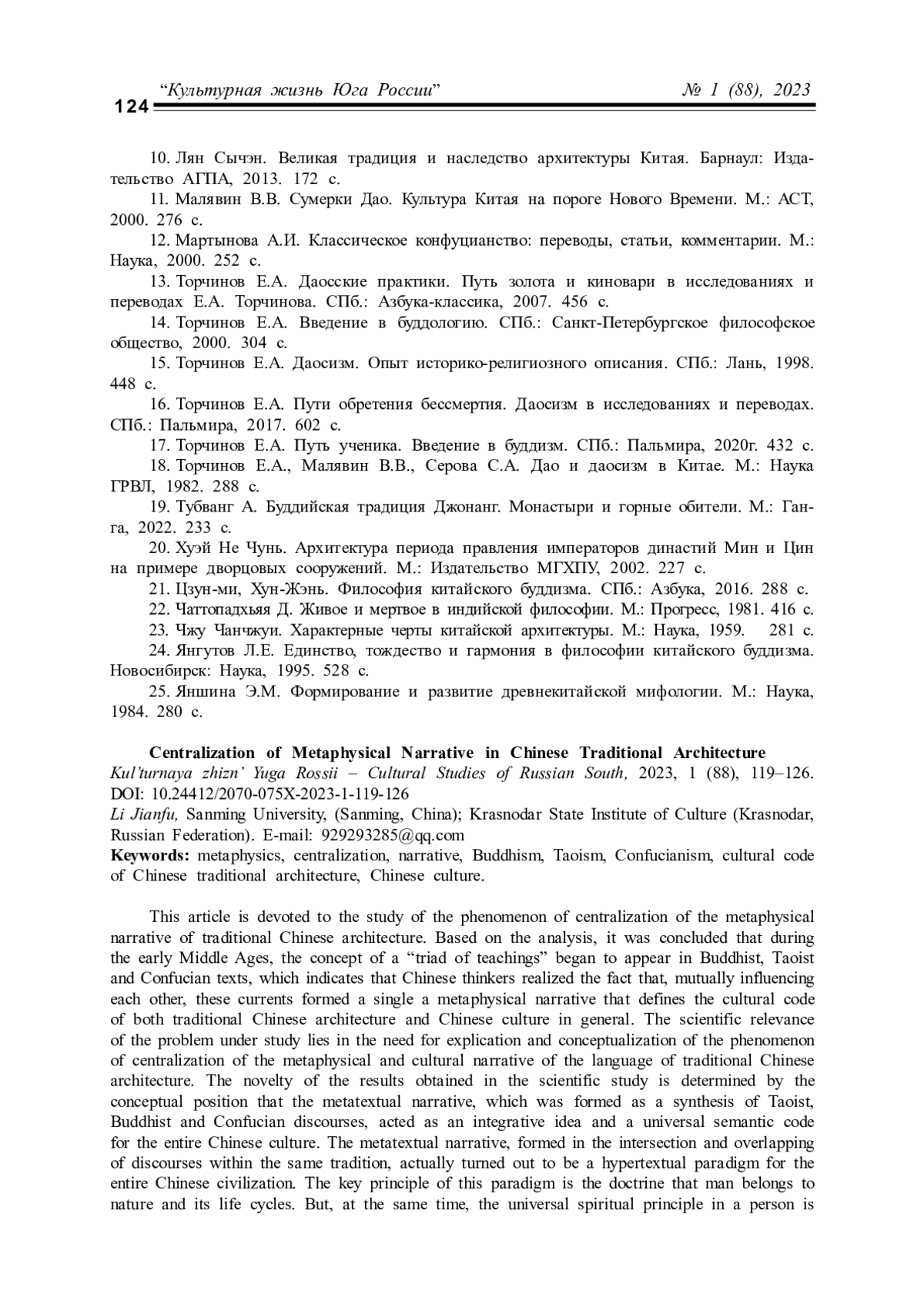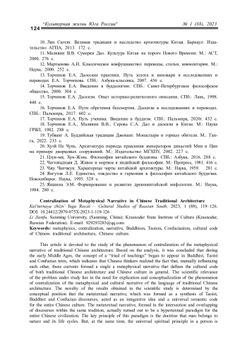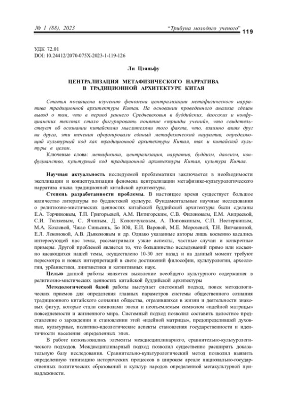 ЛИ Ц. ЦЕНТРАЛИЗАЦИЯ МЕТАФИЗИЧЕСКОГО НАРРАТИВА В ТРАДИЦИОННОЙ АРХИТЕКТУРЕ КИТАЯ // КУЛЬТУРНАЯ ЖИЗНЬ ЮГА РОССИИ. 2023. № 1 (88)