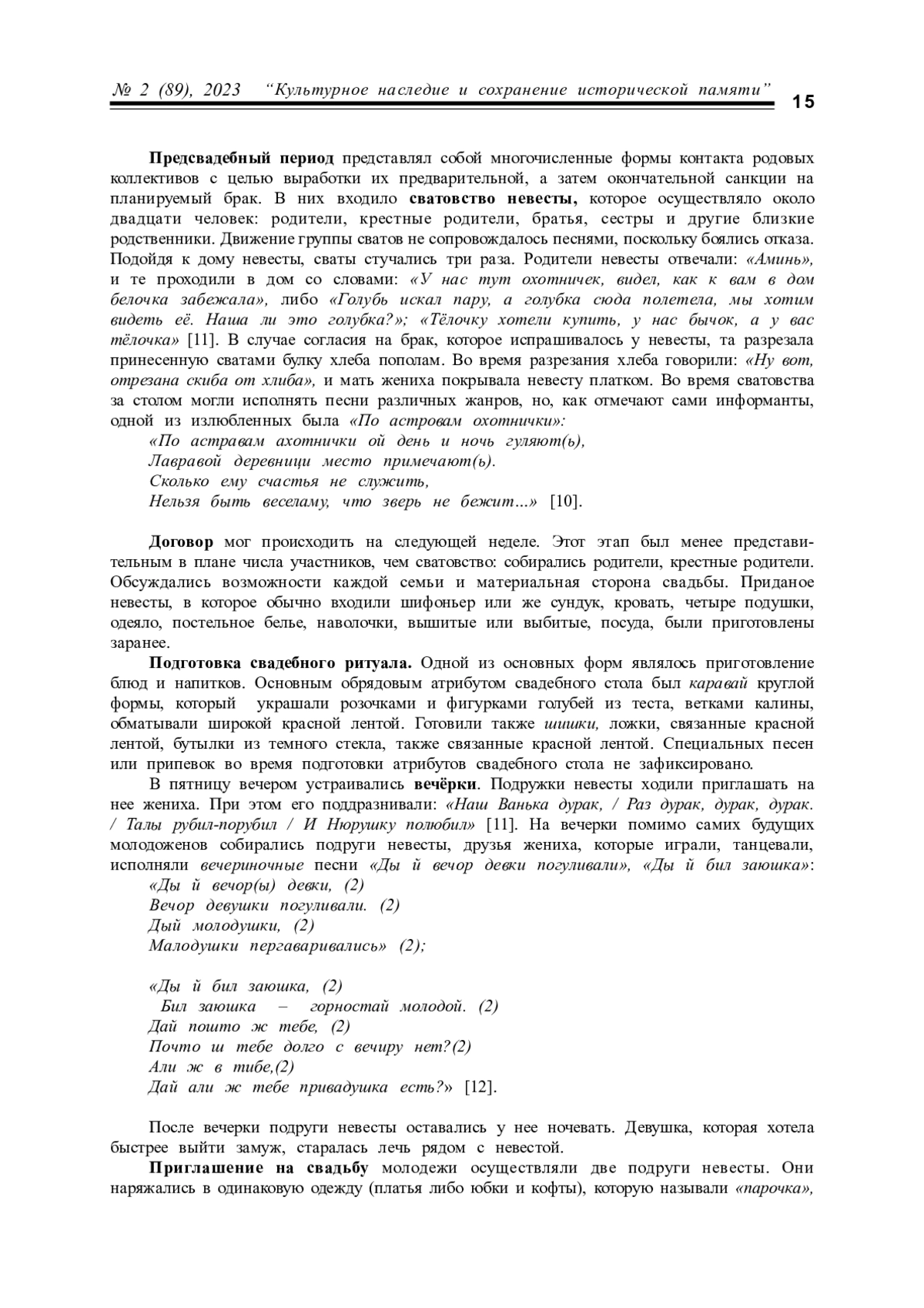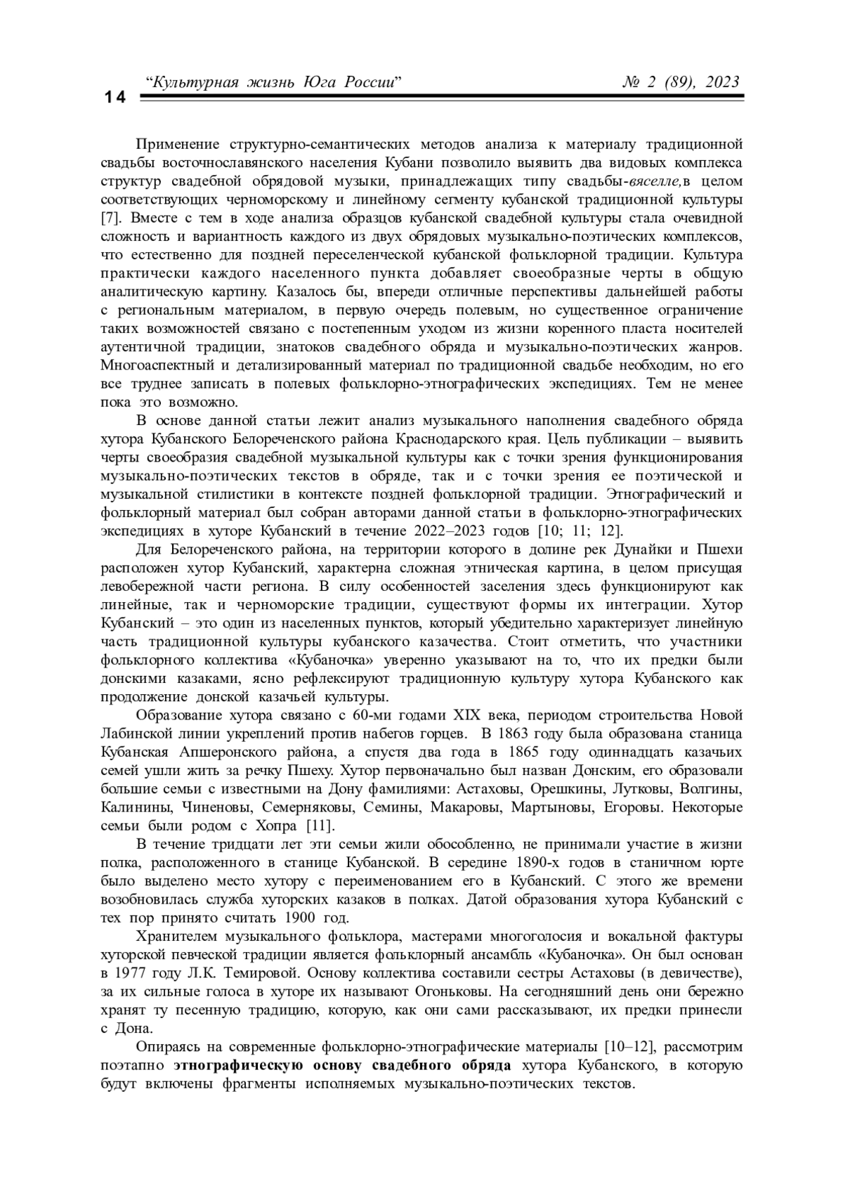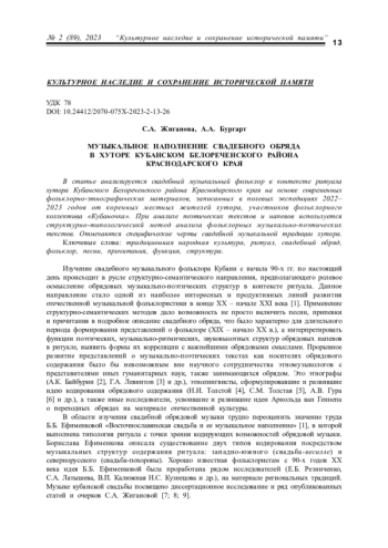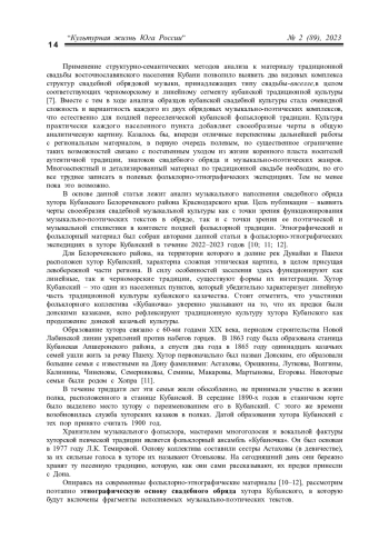 Изучение свадебного музыкального фольклора Кубани с начала 90-х гг. по настоящий день происходит в русле структурно-семантического направления, предполагающего ролевое осмысление обрядовых музыкально-поэтических структур в контексте ритуала. Данное направление стало одной из наиболее интересных и продуктивных линий развития отечественной музыкальной фольклористики в конце ХХ – начале XXI века [1]. Применение структурно-семантических методов дало возможность не просто включить песни, припевки и причитания в подробное описание свадебного обряда, что было характерно для длительного периода формирования представлений о фольклоре (XIX – начало XX в.), а интерпретировать функции поэтических, музыкально-ритмических, звуковысотных структур обрядовых напевов в ритуале, выявить формы их корреляции с важнейшими обрядовыми смыслами. Прорывное развитие представлений о музыкально-поэтических текстах как носителях обрядового содержания было бы невозможным вне научного сотрудничества этномузыкологов с представителями иных гуманитарных наук, также занимающихся обрядом.