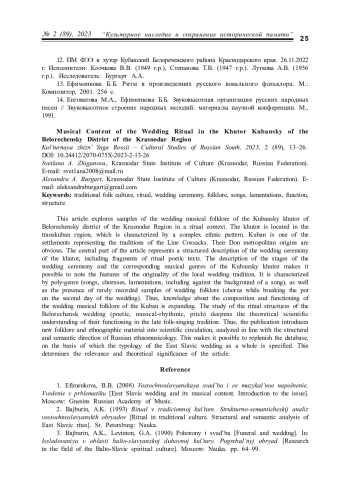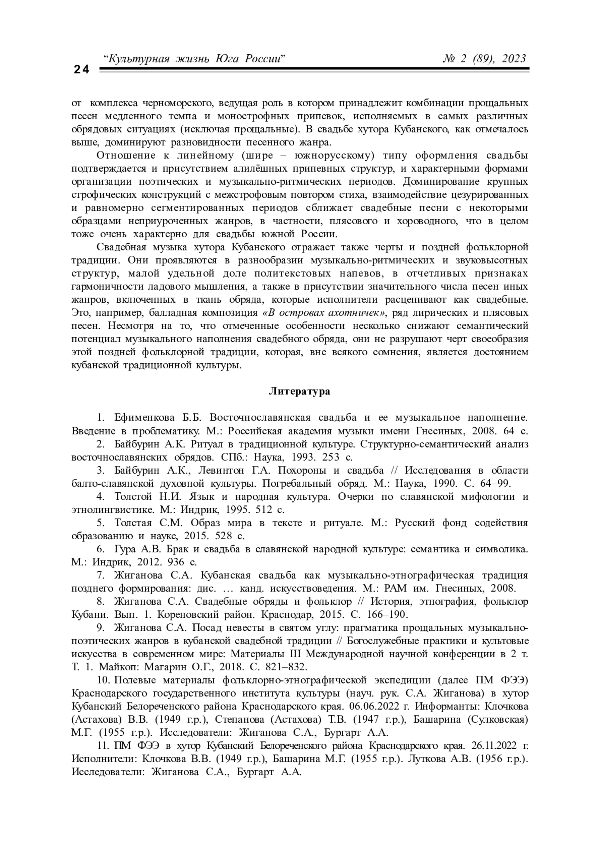 7. Жиганова С.А. Кубанская свадьба как музыкально-этнографическая традиция позднего формирования: дис. … канд. искусствоведения. М.: РАМ им. Гнесиных, 2008. EDN: QDYQPP
