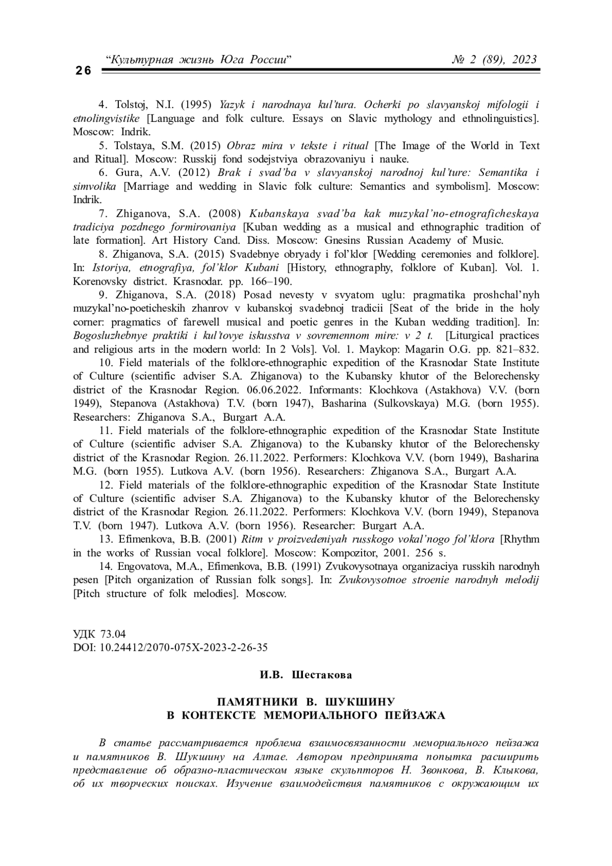 9. Жиганова С.А. Посад невесты в святом углу: прагматика прощальных музыкально-поэтических жанров в кубанской свадебной традиции // Богослужебные практики и культовые искусства в современном мире: Материалы III Международной научной конференции в 2 т. Т. 1. Майкоп: Магарин О.Г., 2018. С. 821-832. EDN: YAONID