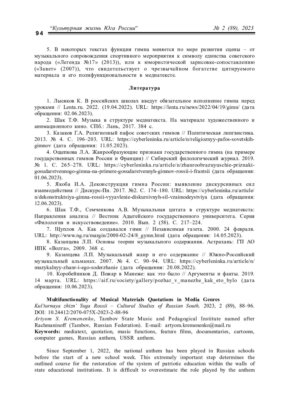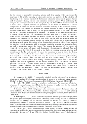 6. Шак Т.Ф., Семченкова А.В. Музыкальная цитата в структуре медиатекста: Направления анализа // Вестник Адыгейского государственного университета. Серия “Филология и искусствоведение”. 2010. Вып. 2 (58). С. 217-224.