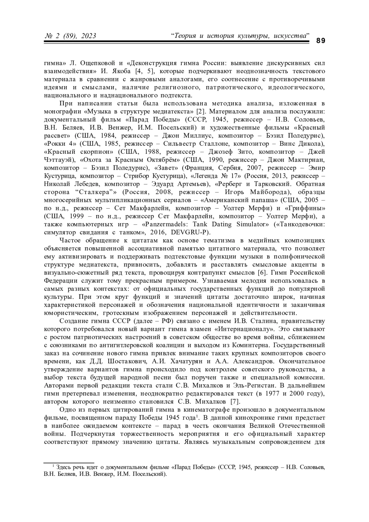 C 1 сентября 2022 года в школах России перед началом новой учебной недели исполняется государственный гимн [1]. Этот чрезвычайно важный шаг определяет наметившийся курс на восстановление системы патриотического воспитания в стенах государственных образовательных учреждений. Трудно переоценить роль, которую играет гимн в процессе формирования личности, национальной и гражданской идентичности, что определяет актуальность данной статьи, включающую обзор-ретроспективу и анализ принципов функционирования музыкального материала гимна России в различных медиажанрах: художественном и документальном кинематографе, мультфильмах и анимации, компьютерных играх
