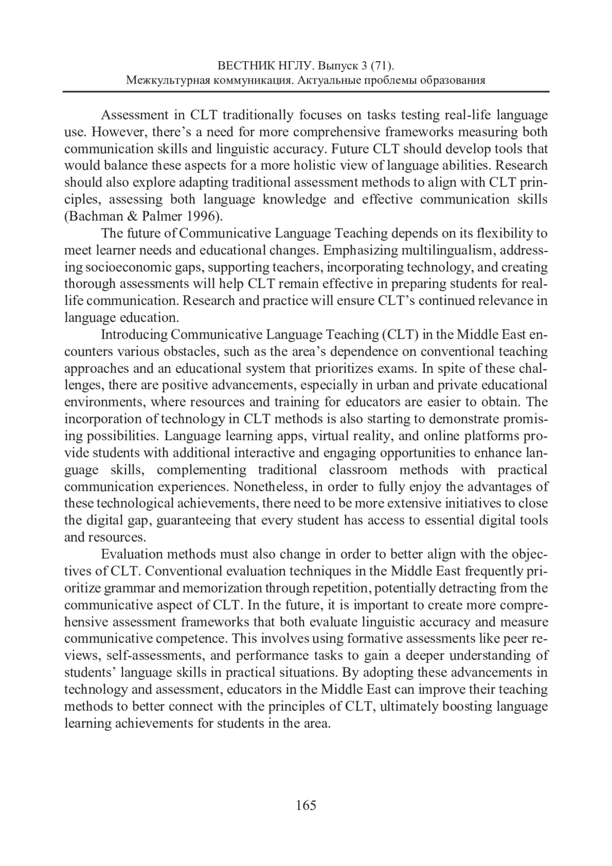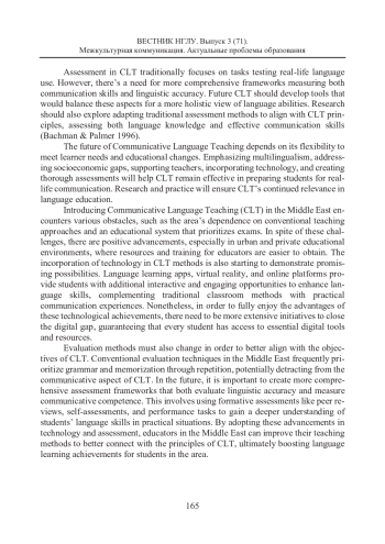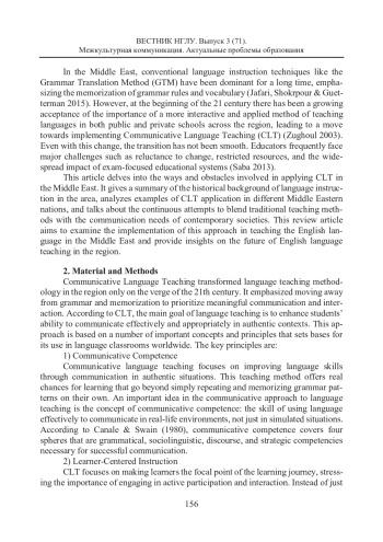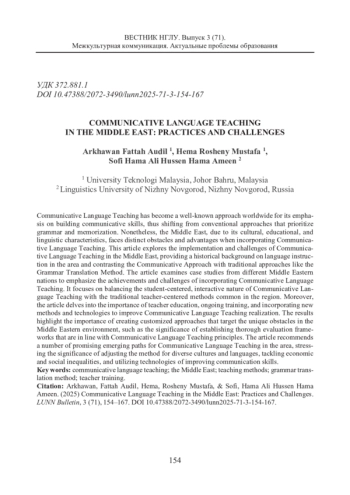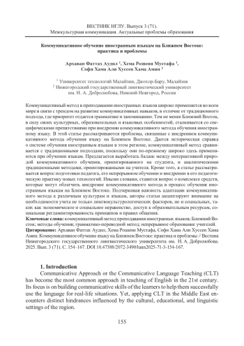Коммуникативный метод в преподавании иностранных языков широко применяется во всем мире в связи с трендом на развитие коммуникативных навыков, в отличие от традиционного подхода, где приоритет отдается грамматике и запоминанию. Тем не менее Ближний Восток, в силу своих культурных, образовательных и языковых особенностей, сталкивается со специфическими препятствиями при внедрении коммуникативного метода обучения иностранному языку. В этой статье рассматриваются проблемы, связанные с внедрением коммуникативного метода обучения языку на Ближнем Востоке. Дается историческая справка о системе обучения иностранным языкам в этом регионе, коммуникативный метод сравнивается с традиционными подходами, поскольку они по-прежнему широко здесь применяются при обучении языкам. Предлагается выработать баланс между интерактивной природой коммуникативного обучения, ориентированного на студента, и аналитическими традиционными методами, ориентированными на учителя. Кроме того, в статье рассматривается вопрос подготовки педагога, его непрерывном обучении и внедрении в его педагогическую практику новых технологий. Иными словами, ставится вопрос о комплексе средств, которые могут облегчить внедрение коммуникативного метода в процесс обучения иностранным языкам на Ближнем Востоке. Подчеркивая важность адаптации коммуникативного метода к различным культурам и языкам, авторы статьи акцентируют внимание на необходимости учета не только лингвокультурологических факторов, но и социальных, таких как экономическое и социальное неравенство, доступ к образовательным ресурсам, социальная регламентированность принципов и правил общения.