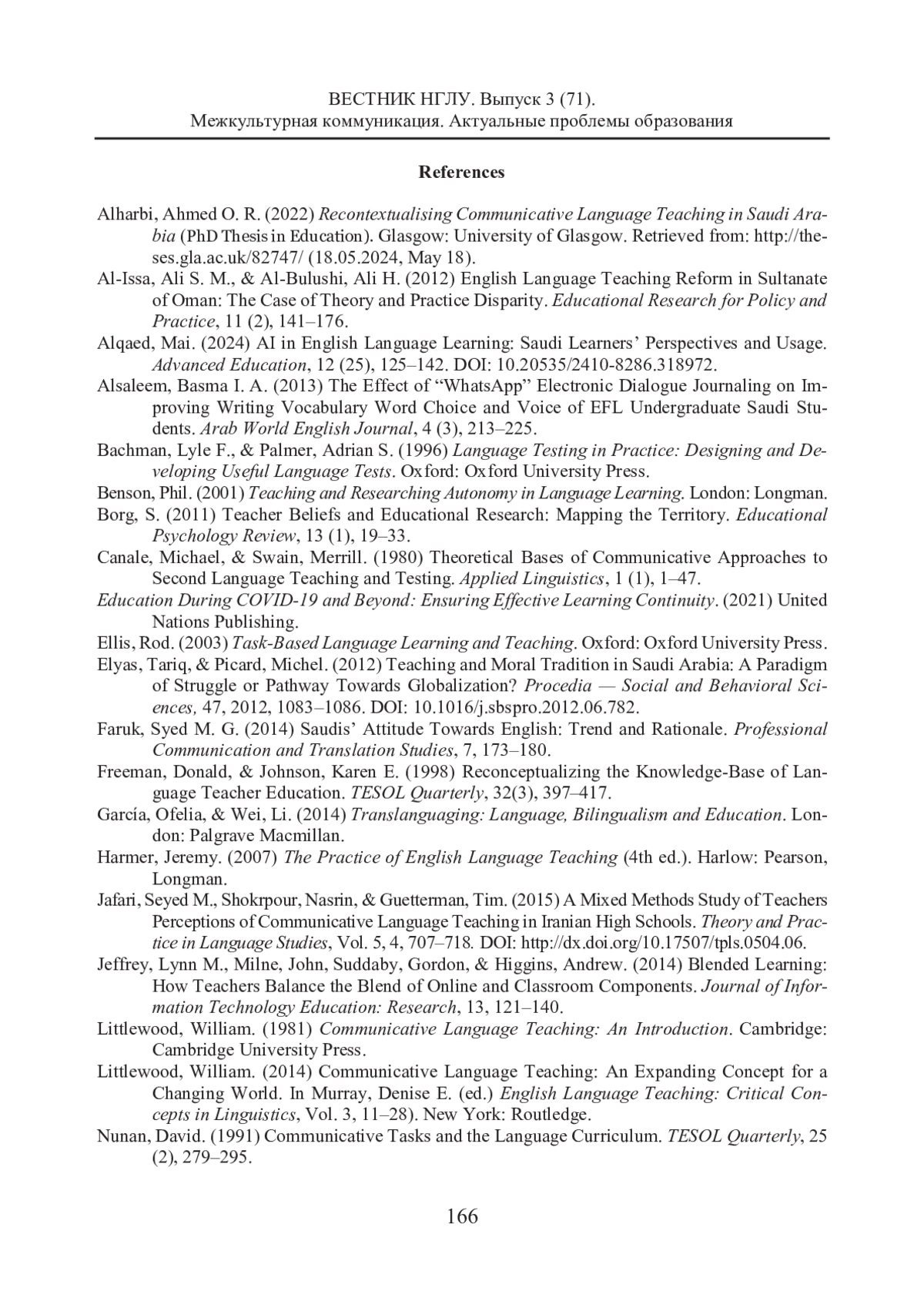 1. Alharbi, Ahmed O. R. (2022) Recontextualising Communicative Language Teaching in Saudi Arabia (PhD Thesis in Education). Glasgow: University of Glasgow. Retrieved from: http://theses.gla.ac.uk/82747/ (18.05.2024, May 18).