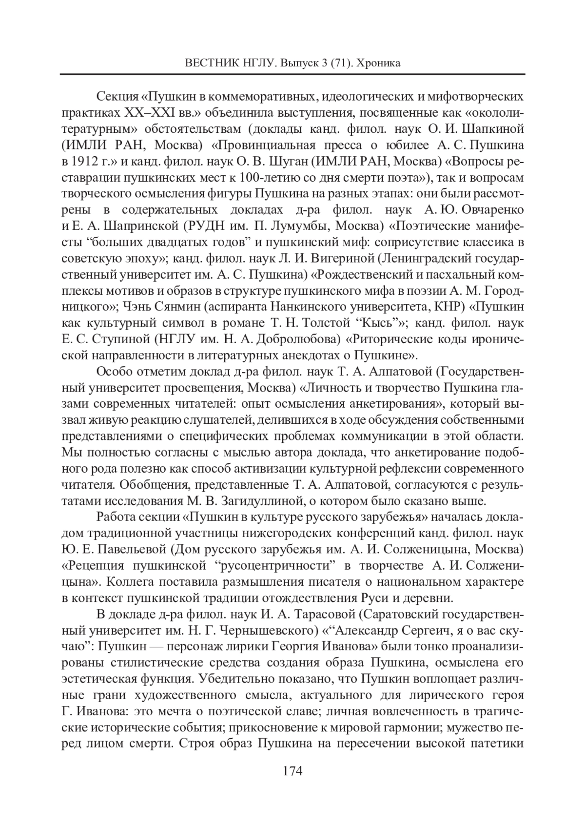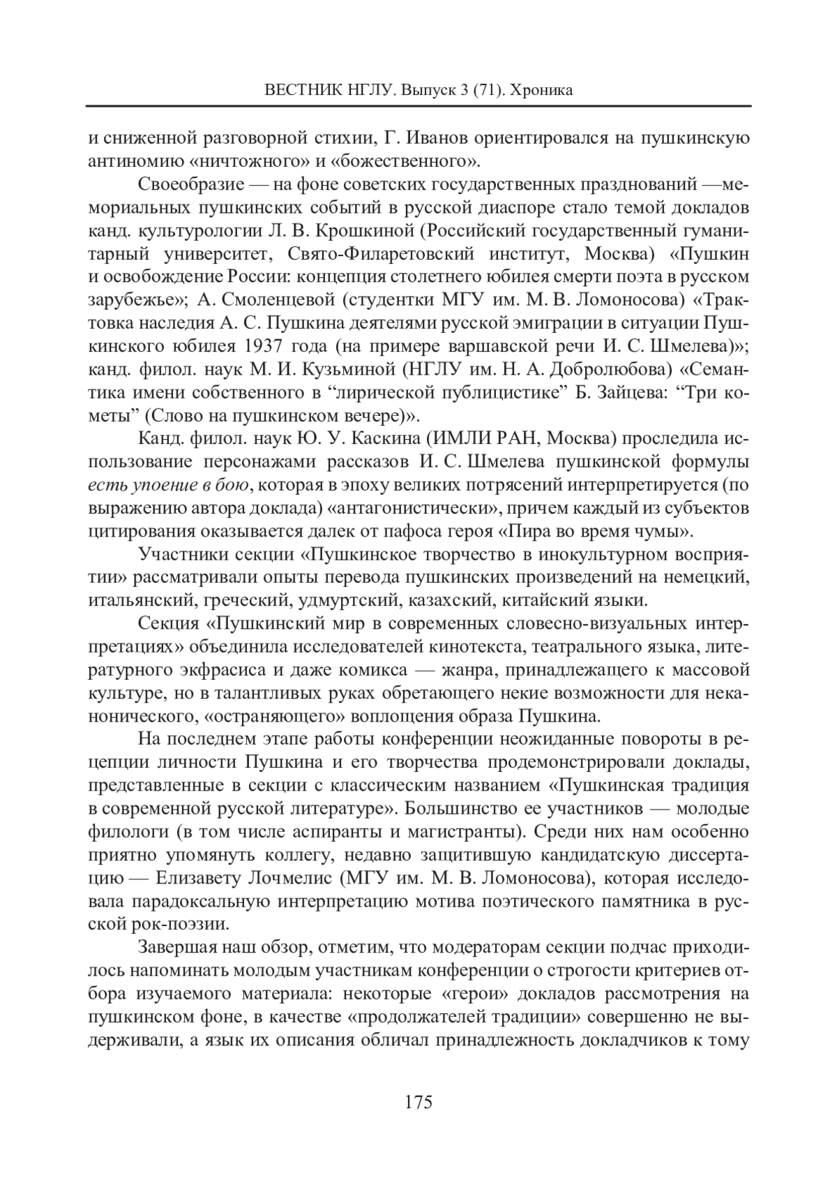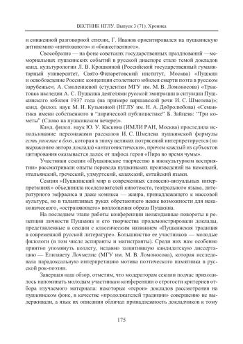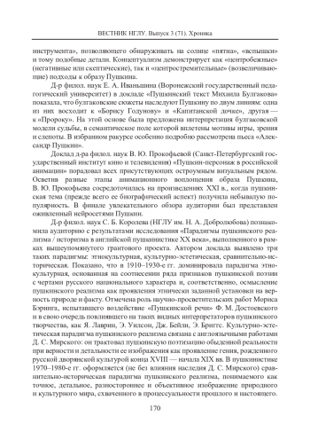 Пленарное заседание обозначило основные направления дальнейшей работы конференции. Оно открылось докладом д-ра филол. наук М. В. Загидуллиной (Челябинский государственный университет) «Пушкинский миф на обломках прецедентной базы: о современном состоянии рецепции Пушкина поколением 2000-х годов (к постановке проблемы)». Была рассмотрена динамика пушкинского мифа в XIX–XX столетиях в условиях развития всеобщего образования, проанализирована ситуация в области «пушкинской индоктринации» после недавнего присвоения экзамену по литературе статуса «по выбору» (то есть фактической маргинализации школьного литературного образования). Это позволило представить контуры научного исследования, направленного на выявление реального места пушкинского мифа в современном культурном пространстве, с учетом специфичности сознания поколений 2000-х гг. и младше. Констатируя, что пушкинский миф десятилетиями работал на воспроизведение национальной идентичности, поддержание ее непрерывности, М. В. Загидуллина показала различные признаки падения пушкинской прецедентной базы в национальном масштабе.