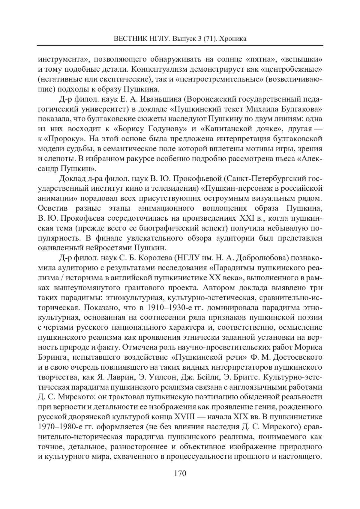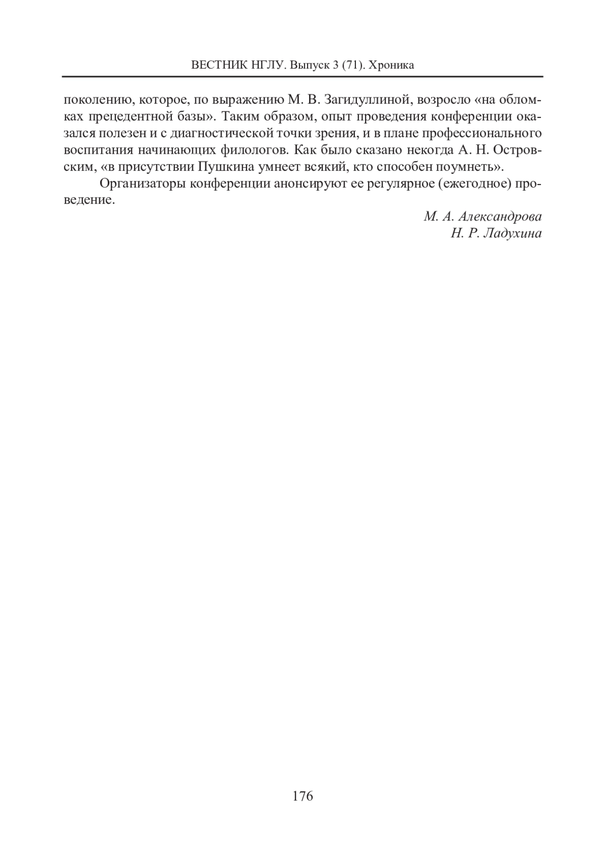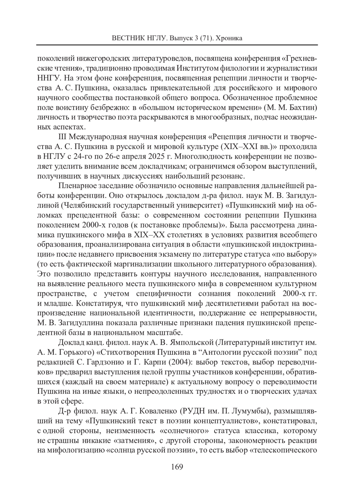 Пленарное заседание обозначило основные направления дальнейшей работы конференции. Оно открылось докладом д-ра филол. наук М. В. Загидуллиной (Челябинский государственный университет) «Пушкинский миф на обломках прецедентной базы: о современном состоянии рецепции Пушкина поколением 2000-х годов (к постановке проблемы)». Была рассмотрена динамика пушкинского мифа в XIX–XX столетиях в условиях развития всеобщего образования, проанализирована ситуация в области «пушкинской индоктринации» после недавнего присвоения экзамену по литературе статуса «по выбору» (то есть фактической маргинализации школьного литературного образования). Это позволило представить контуры научного исследования, направленного на выявление реального места пушкинского мифа в современном культурном пространстве, с учетом специфичности сознания поколений 2000-х гг. и младше. Констатируя, что пушкинский миф десятилетиями работал на воспроизведение национальной идентичности, поддержание ее непрерывности, М. В. Загидуллина показала различные признаки падения пушкинской прецедентной базы в национальном масштабе.