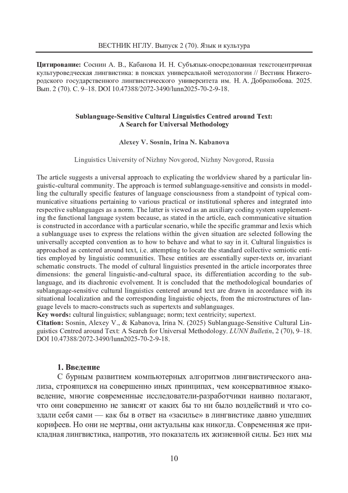 В статье изложен универсальный подход к объяснению языковой картины мира, присущей определенному лингвокультурному сообществу, названный субъязык-опосредованным и представляющий собой моделирование культурно обусловленных характеристик языкового сознания с позиций типичных коммуникативных ситуаций, закрепленных в различных предметных или институциональных сферах и интегрированных в соответствующие им субъязыки в качестве нормы. Последняя при этом рассматривается в качестве еще одной системы кодирования в дополнение к функциональной системе языка, поскольку, как указывается авторами, каждая коммуникативная ситуация конструируется в соответствии с конкретным сценарием, а специфическое лексико-грамматическое наполнение, которым располагает субъязык для выражения внутриситуативных отношений, подводится под общезначимую конвенцию, как вести себя и что говорить в данной ситуации. Текстоцентричность культуроведческой лингвистики обнаруживается в выявлении присущей лингвосообществам коллективной стандартизации, при этом в качестве ее стандартных элементов рассматриваются типические построения по типу сверхтекстов, или инвариатных, схематичных конструктов. Модель культуроведческого языкознания, представленная в статье, включает три измерения: общее лингвокультурное пространство, субъязыковая дифференциация и диахроническое развитие. Заключается, что методологические рамки субъязык-опосредованной текстоцентричной культуроведческой лингвистики устанавливаются относительно границ ее предметно-ситуативной локализации и анализа соответствующих языковых объектов, начиная с уровневых языковых микроструктур и заканчивая макроструктурными построениями по типу сверхтекстов и субъязыков.