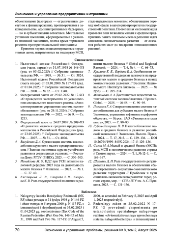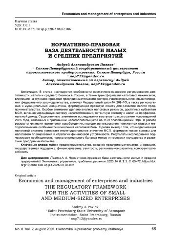 В статье исследуются особенности нормативно- правового регулирования деятельности малого и среднего бизнеса в России, а также трансформация налоговых механизмов, влияющих на функционирование предпринимательского сектора. Рассмотрены ключевые положения федерального законодательства, включая Федеральный закон № 209-ФЗ, а также региональные и муниципальные инициативы, формирующие правовую основу для развития малого предпринимательства. Особое внимание уделено анализу налоговых режимов, доступных субъектам МСП, включая упрощённую систему налогообложения, патентную систему и налог на профессиональный доход. Существенным элементом исследования выступает рассмотрение нововведений 2025 года, связанных с признанием налогоплательщиков на УСН плательщиками НДС. В работе раскрыты критерии применения освобождения, порядок использования пониженных ставок и методологические особенности исчисления налоговой базы. Сделан вывод о том, что модернизация налоговой системы усиливает институциональное значение МСП, формируя новые вызовы для налогового планирования и стратегии финансовой устойчивости. Результаты исследования подчеркивают необходимость поиска оптимального баланса между интересами государства и развитием предпринимательства.