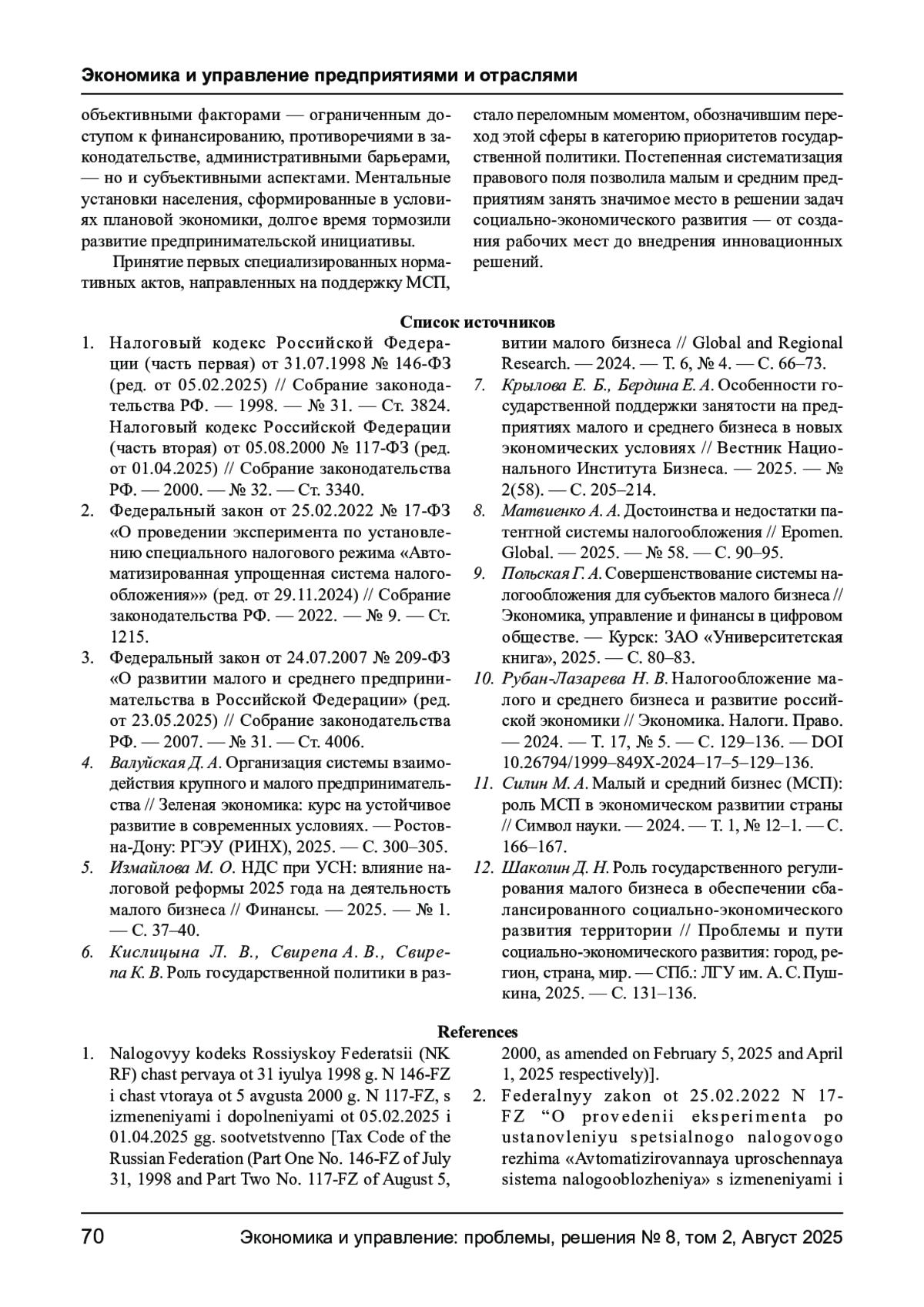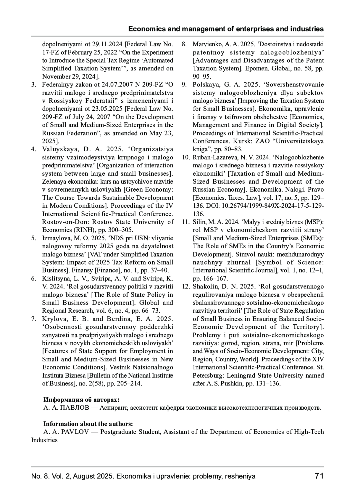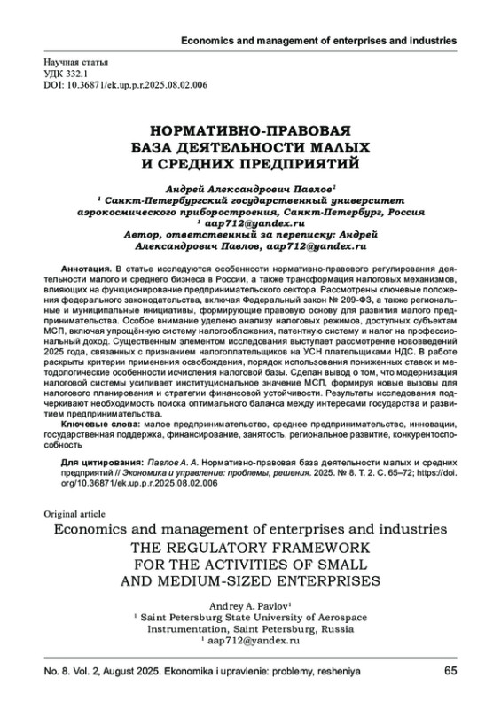 ПАВЛОВ А. А. НОРМАТИВНО-ПРАВОВАЯ БАЗА ДЕЯТЕЛЬНОСТИ МАЛЫХ И СРЕДНИХ ПРЕДПРИЯТИЙ // ЭКОНОМИКА И УПРАВЛЕНИЕ: ПРОБЛЕМЫ, РЕШЕНИЯ. 2025. ТОМ 2 № 8