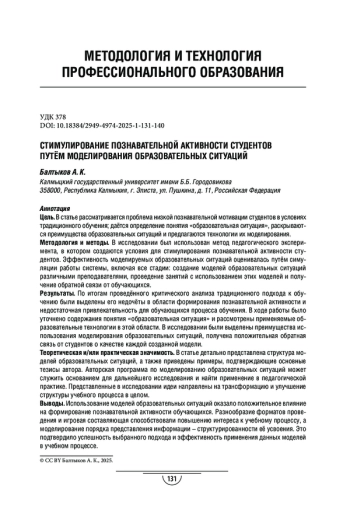 Статья: СТИМУЛИРОВАНИЕ ПОЗНАВАТЕЛЬНОЙ АКТИВНОСТИ СТУДЕНТОВ ПУТЁМ МОДЕЛИРОВАНИЯ ОБРАЗОВАТЕЛЬНЫХ СИТУАЦИЙ (2025)