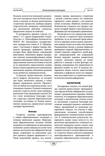 Выводы. Использование моделей образовательных ситуаций оказало положительное влияние на формирование познавательной активности обучающихся. Разнообразие форматов проведения и игровая составляющая способствовали повышению интереса к учебному процессу, а моделирование порядка представления информации - структурированности её усвоения. Это подтвердило успешность выбранного подхода и эффективность применения данных моделей в учебном процессе.