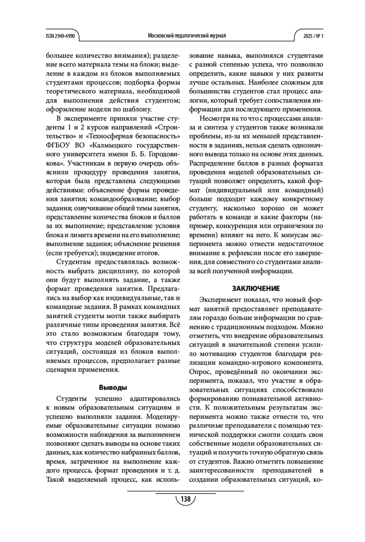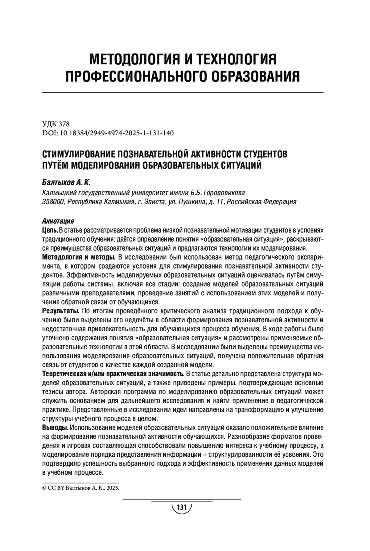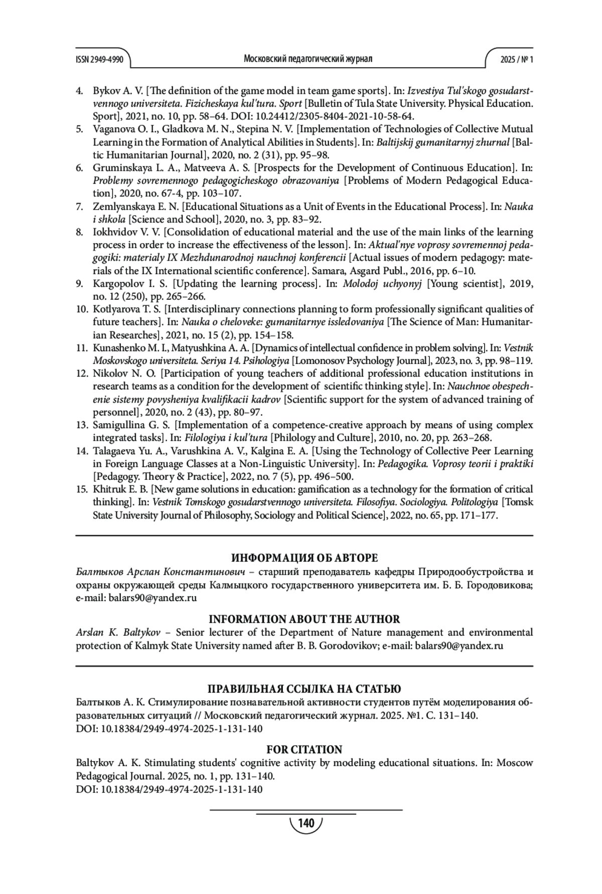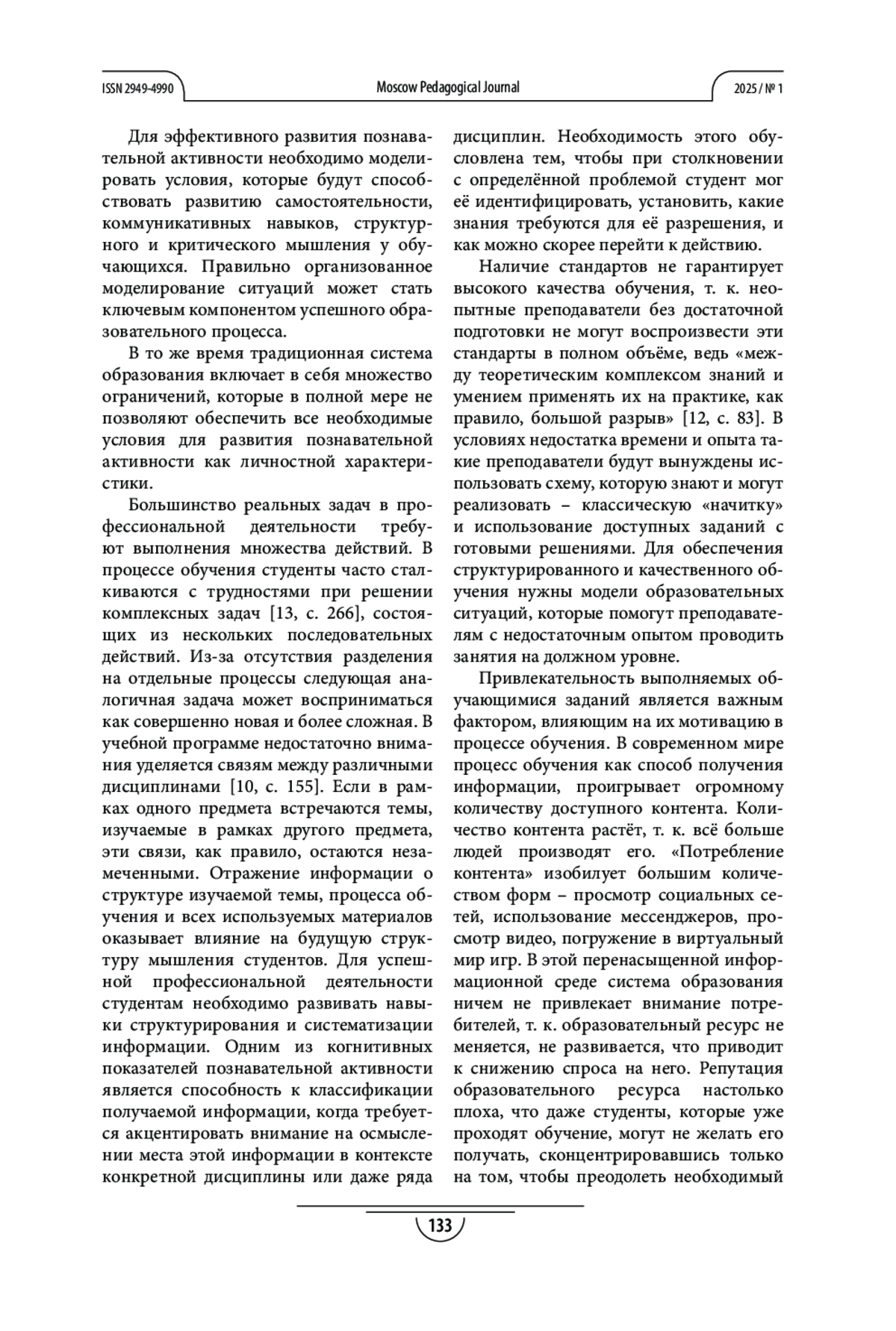 БАЛТЫКОВ А. К. СТИМУЛИРОВАНИЕ ПОЗНАВАТЕЛЬНОЙ АКТИВНОСТИ СТУДЕНТОВ ПУТЁМ МОДЕЛИРОВАНИЯ ОБРАЗОВАТЕЛЬНЫХ СИТУАЦИЙ // МОСКОВСКИЙ ПЕДАГОГИЧЕСКИЙ ЖУРНАЛ. 2025. № 1