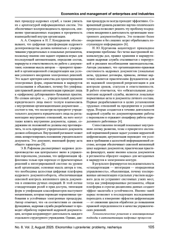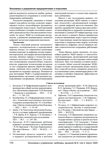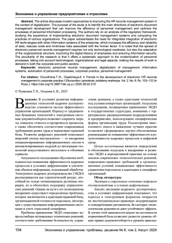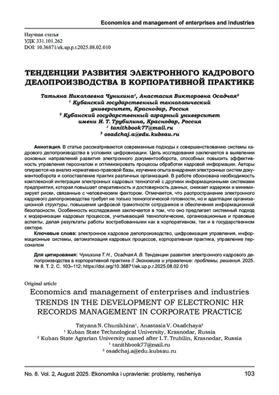 ЧУНИХИНА Т. Н., ОСАДЧАЯ А. В. ТЕНДЕНЦИИ РАЗВИТИЯ ЭЛЕКТРОННОГО КАДРОВОГО ДЕЛОПРОИЗВОДСТВА В КОРПОРАТИВНОЙ ПРАКТИКЕ // ЭКОНОМИКА И УПРАВЛЕНИЕ: ПРОБЛЕМЫ, РЕШЕНИЯ. 2025. ТОМ 2 № 8