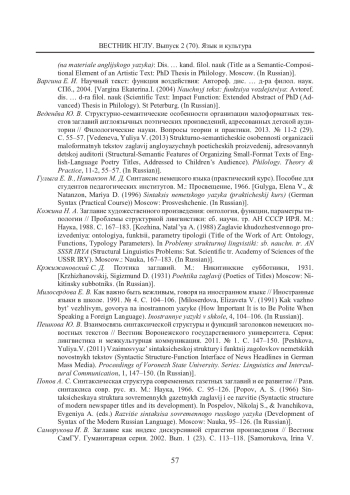 16. Филлипова С. Г. Прагматика заглавий романов X. Хоссейни: межкультурный аспект // Вестник Дагестанского государственного университета. Серия 2: Гуманитарные науки. 2021. T. 36. № 4. С. 88-94. EDN: COBOLD