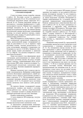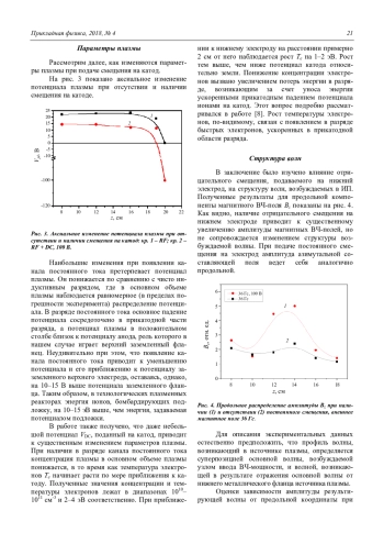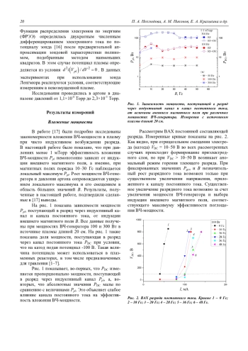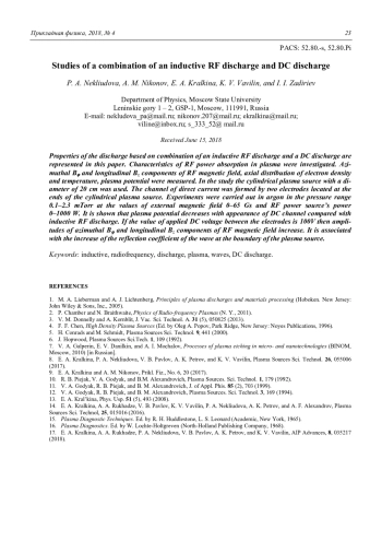 В настоящей работе изучены характеристики разряда, основанного на комбинации индуктивного высокочастотного (ВЧ) разряда и разряда постоянного тока. Исследованы закономерности вложения ВЧ-мощности в плазму, выполнены измерения азимутальной B и продольной Bz составляющих высокочастотного магнитного поля, аксиального распределения концентрации и температуры электронов, потенциала пространства. В качестве объекта исследования использован однокамерный цилиндрический источник плазмы диаметром 20 см. Канал постоянного тока сформирован двумя электродами, расположенными на торцах цилиндрического источника плазмы. Измерения выполнены в аргоне в диапазоне давлений 0,1–2,3 мТорр при значениях индукции внешнего магнитного поля 0–60 Гс и мощностях ВЧ-генератора 0–1000 Вт. Показано, что при появлении канала постоянного тока потенциал плазмы понижается по сравнению с чисто индуктивным разрядом. При подаче между электродами напряжения 100 В амплитуда продольной и азимутальной компонент магнитного ВЧ-поля возрастает, что связано с увеличением коэффициента отражения волны на границе источника плазмы.