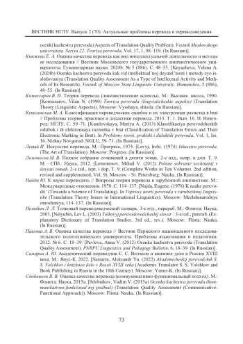 18. Павлова А. В. Оценка качества перевода // Вестник Пермского национального исследовательского политехнического университета. Проблемы языкознания и педагогики. 2012. № 6. С. 18-39.