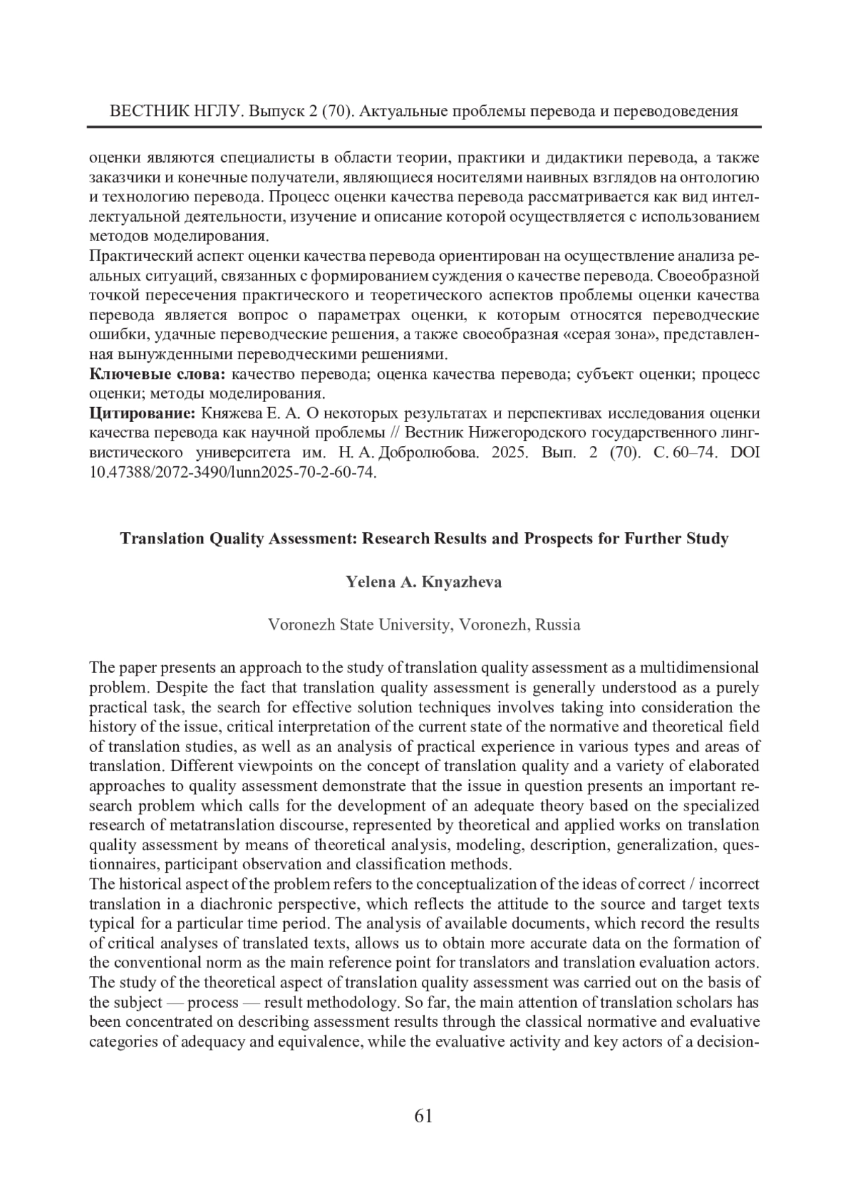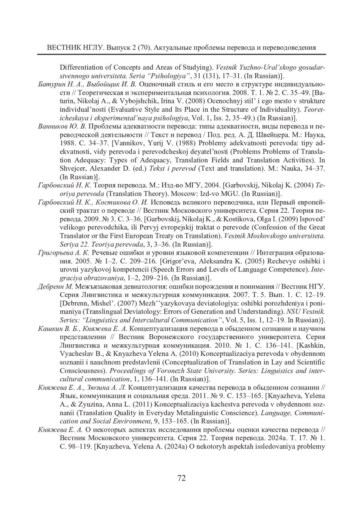 10. Княжева Е. А. О некоторых аспектах исследования проблемы оценки качества перевода // Вестник Московского университета. Серия 22. Теория перевода. 2024а. Т. 17. № 1. С. 98-119. EDN: JSJNFW