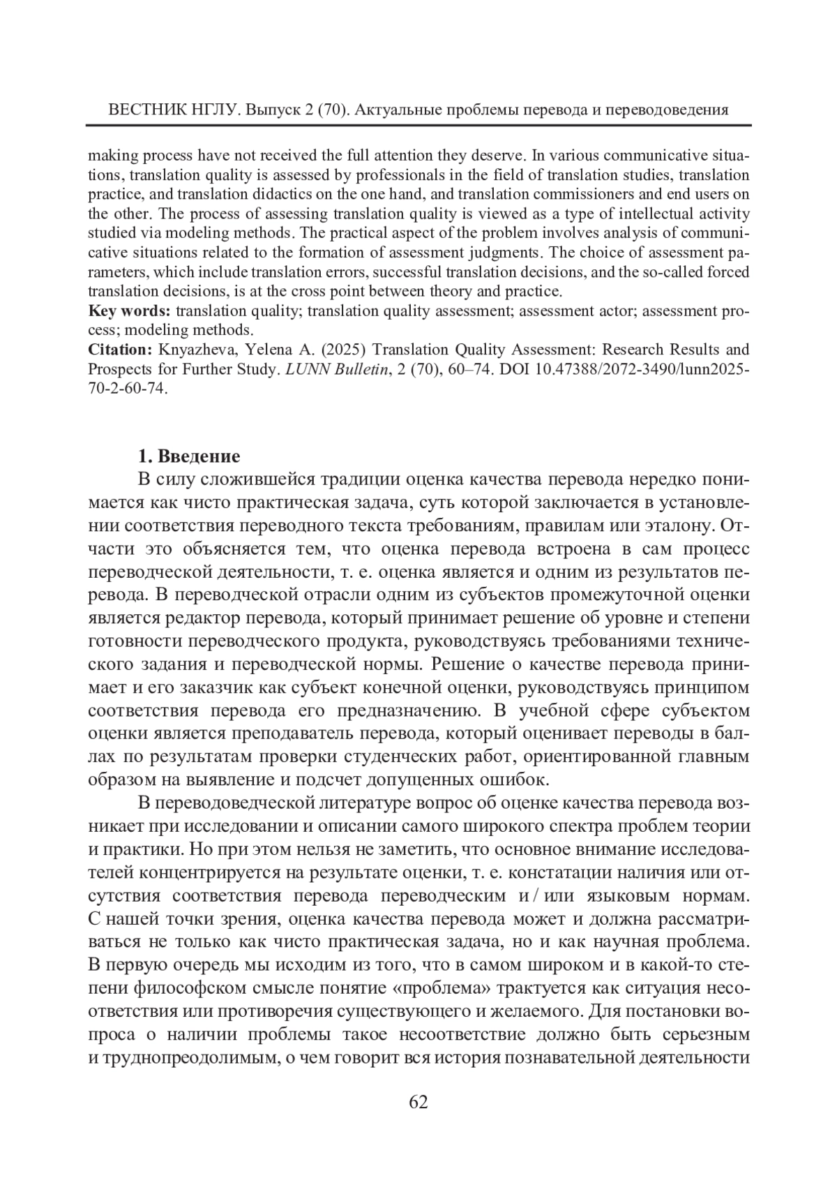 11. Княжева Е. А. Оценка качества перевода как вид интеллектуальной деятельности и методы ее исследования // Вестник Московского государственного лингвистического университета. Гуманитарные науки. 2024b. № 5 (886). С. 48-55. EDN: TBQNQM