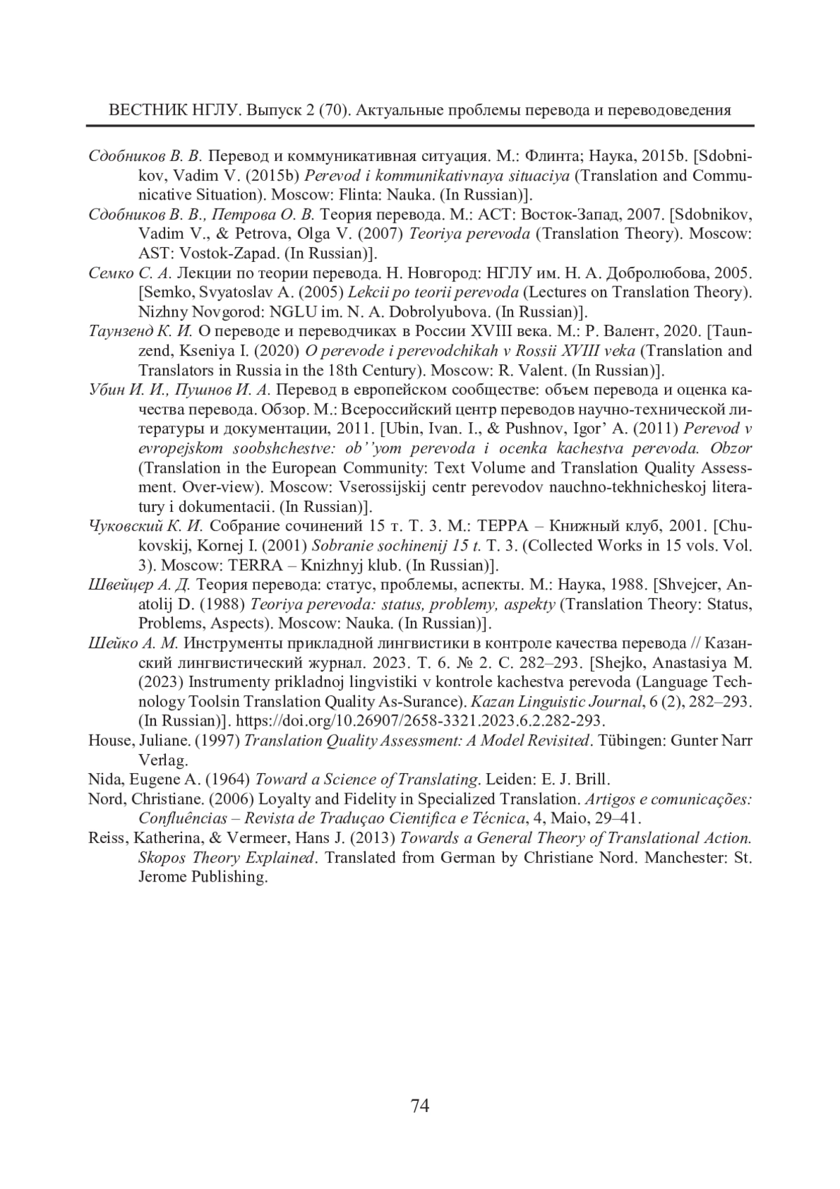 20. Сдобников В. В. Оценка качества перевода (коммуникативно-функциональный подход). М.: Флинта: Наука, 2015а. EDN: POHULU