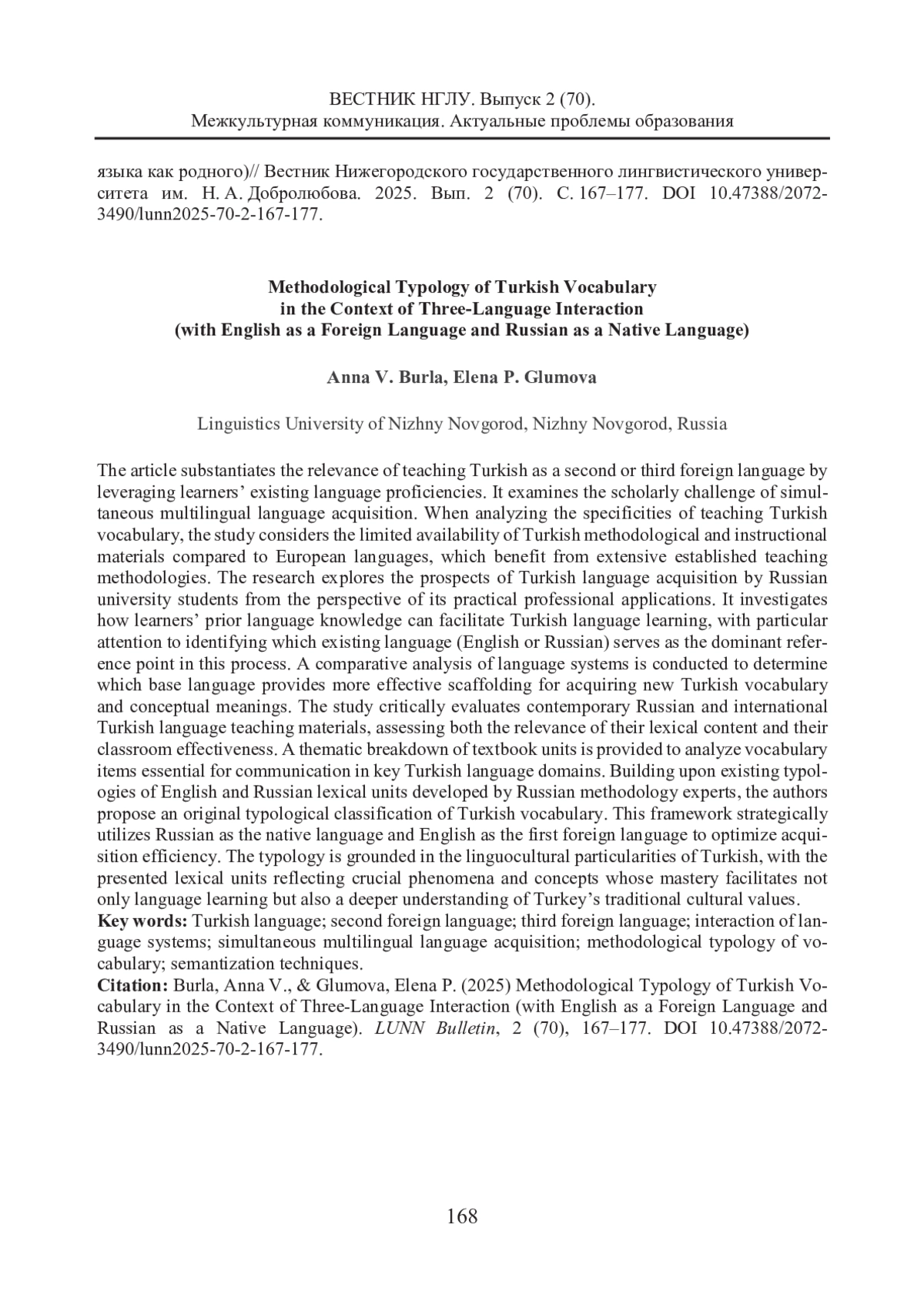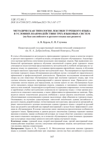 В статье обосновывается актуальность преподавания турецкого языка в качестве второго и третьего иностранного с опорой на языки, которыми владеют обучающиеся. Анализируется научная проблема соизучения нескольких иностранных языков. При выявлении особенностей организации процесса обучения лексической стороне речи турецкого языка учитывается недостаточная представленность методической и учебной литературы по турецкому языку по сравнению с условиями преподавания европейских языков, в обучении которым накоплен серьезный научно-методический опыт. Рассматриваются перспективы изучения турецкого языка обучающимися российских вузов с позиций его практического применения в профессиональной деятельности. Проведено исследование возможностей опоры на уже известные обучающимся языки при изучении турецкого языка, при этом сделана попытка выделить превалирующий в данном процессе язык. Приводится сопоставление систем языков для определения, на основе какого из них обучающимся будет легче овладевать новым иностранным языком, усваивать и запоминать значения имеющихся в нем понятий. Акцентируются проблемы содержания современных отечественных и зарубежных учебно-методических комплексов по турецкому языку с точки зрения актуальности их языкового наполнения, а также эффективности применения на занятиях. Приводится список тематических разделов учебников с целью анализа лексических единиц, обеспечивающих коммуникацию в рамках выделенных сфер общения на турецком языке. Основываясь на изучении существующих типологий лексических единиц английского и русского языков, разработанных отечественными методистами, предлагается авторский вариант типологического деления лексических единиц турецкого языка с опорой на русский язык как родной и английский как первый иностранный с целью более эффективного усвоения их обучающимися. В основе типологии лежат лингвокультурологические особенности турецкого языка. Приведенные в данном разделе лексические единицы отражают важные явления и понятия, знание особенностей которых не только облегчит усвоение и запоминание нового языкового материала, но и позволит обучающимся лучше понимать традиционные культурные смысловые ценности жителей страны изучаемого языка.