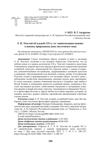 Статья посвящена образу усадьбы и дома в наследии Л. Н. Толстого, особенно в его позднем творчестве. Отмечается, что на рубеже веков и в первое десятилетие XX в. Толстой становится яростным сторонником защиты простого народа и фактически отрицателем прежней усадебной культуры, невозможной без барских домов с садами и парками, дополнительными постройками, содержащимися усилиями крестьян и дворовых, обеспечивавших всю бытовую сторону жизни. В восприятии Толстым усадеб и формировании в его наследии образа частного дома с небольшим хозяйством немаловажное значение играла идея опрощения. В статье показано сложное отношение писателя к усадьбам: при любви к Ясной Поляне и понимании ценности усадебной жизни, отрицалась Толстым чрезмерная роскошь, свойственная городским и загородным усадьбам дворян и людей властных структур. Анализируется обращение Толстого к философии Востока и образу бытия восточных народов, который, по мнению писателя, хранил забытые европейской цивилизацией ключевые основы жизни.