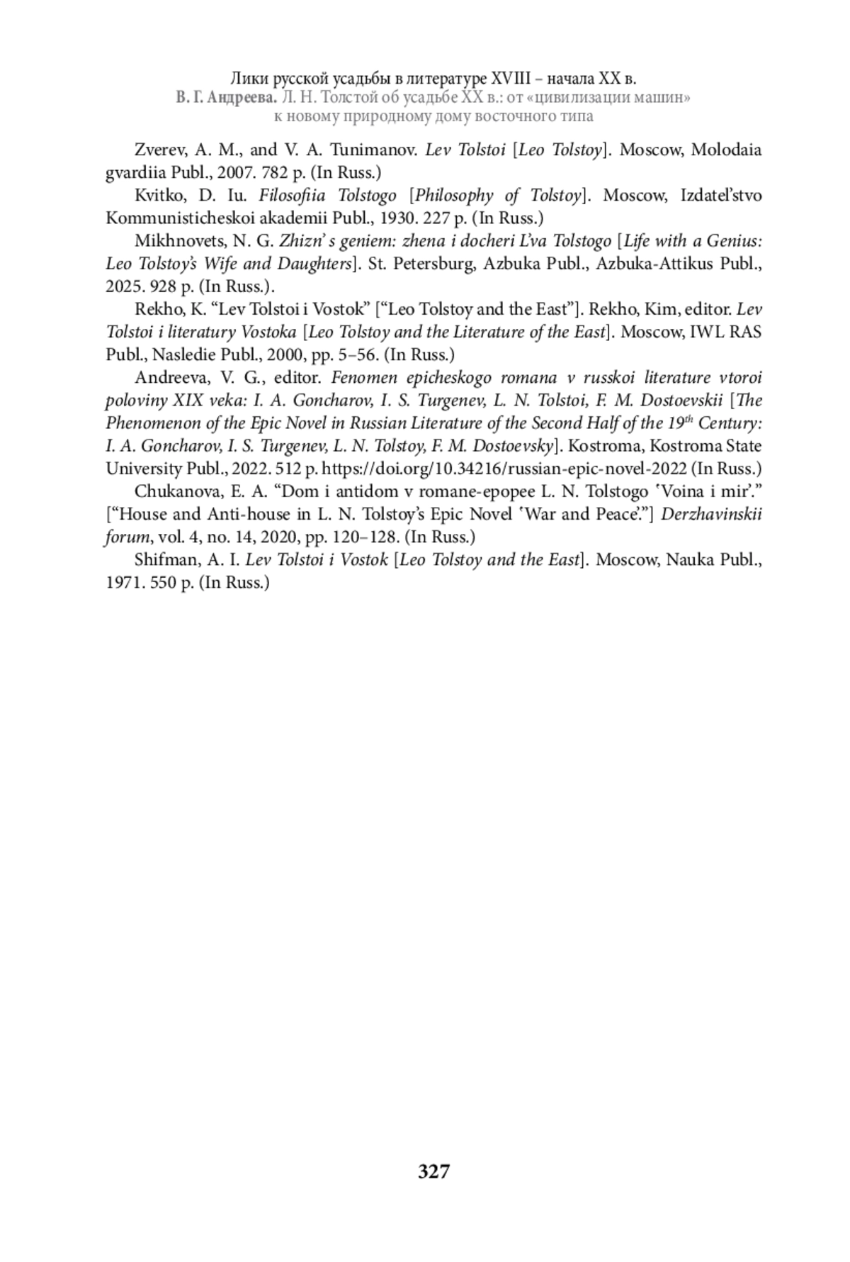 4. Андреева В. Г. Усадебная жизнь Л. Н. Толстого в “Яснополянских записках” Д. П. Маковицкого // Университетский научный журнал. 2022. № 68. С. 36-48. DOI: 10.25807/22225064_2022_68_36